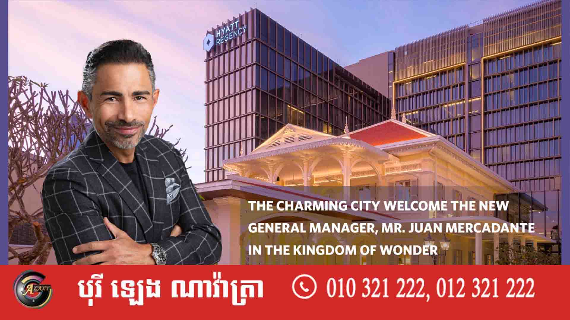 សណ្ឋាគារលំដាប់អន្តរជាតិថ្មីបំផុតនៅក្នុងរាជធានីភ្នំពេញ Hyatt Regency Phnom Penh មានសេចក្តីសោមនស្សរីករាយក្នុងការប្រកាសទទួលស្វាគមន៍អ្នកគ្រប់គ្រងទូទៅថ្មីគឺលោក Juan Mercadante ក្នុងគោលដៅរួម រក្សានូវសមត្ថភាពប្រតិបត្តិការខ្ពស់ និងក្នុងនាមជាសណ្ឋាគារប្រណិតមួយក្នុងរាជធានីភ្នំពេញ។