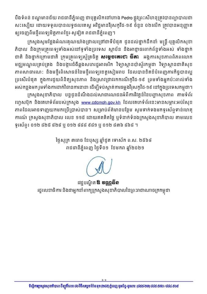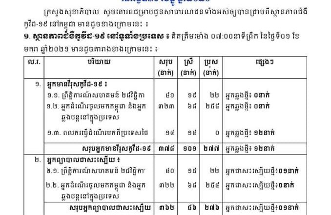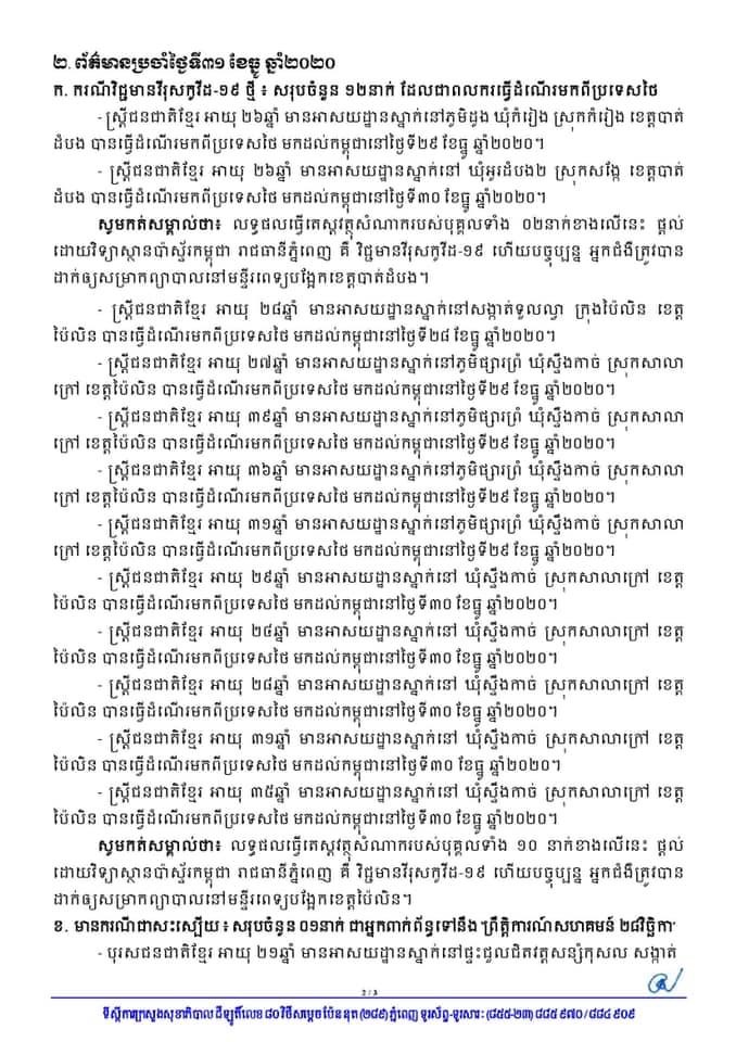 ថ្ងៃទី៣១ ខែធ្នូ ឆ្នាំ២០២០ ក្រសួងសុខាភិបាលបានប្រកាស មានករណីវិជ្ជមានវីរុសកូវីដ-១៩ ថ្មី ចំនួន ១២នាក់ និងមានករណីជាសះស្បេីយចំនួន ០១នាក់ ៖