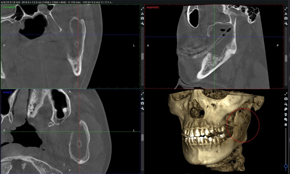 បន្ទាប់ពីការព្យាបាលរយៈពេល ៣ ខែ ដុំសាច់បានរួមតូចបន្តិច ស្រទាប់ឆ្អឹងថ្មីដែលមានកម្រាស់ប្រហែល ២-៣mm បានបង្កើតឡើងយ៉ាងច្បាស់នៅជុំវិញប្រហោងនៃដុំសាច់។ ក្នុងអំឡុងពេលនៃការតាមដាននៅខែមេសា ឆ្នាំ២០២៥ អ្នកជំងឺបានរីករាយប្រាប់ថាគាត់អាចញ៉ាំ បើកមាត់បានធម្មតា និងស្ទើរតែគ្មានការឈឺចាប់។