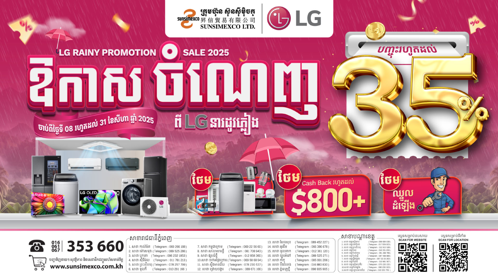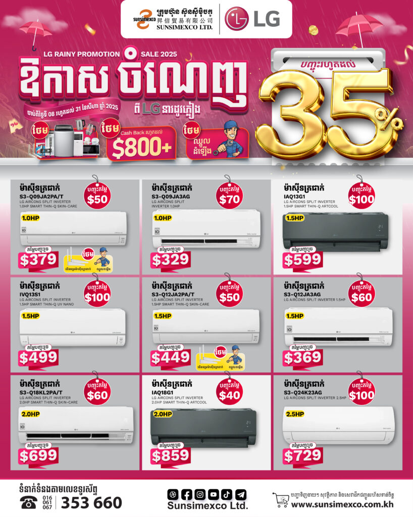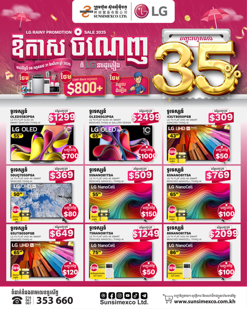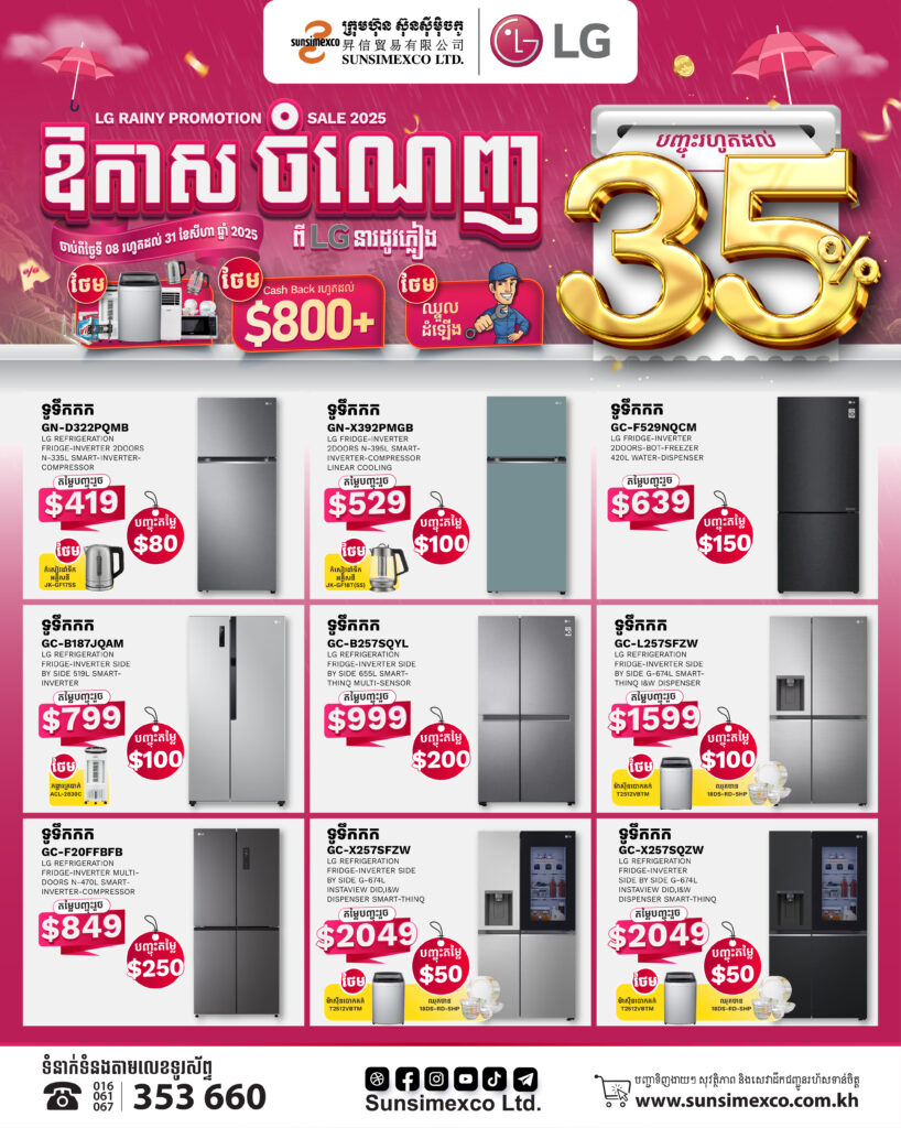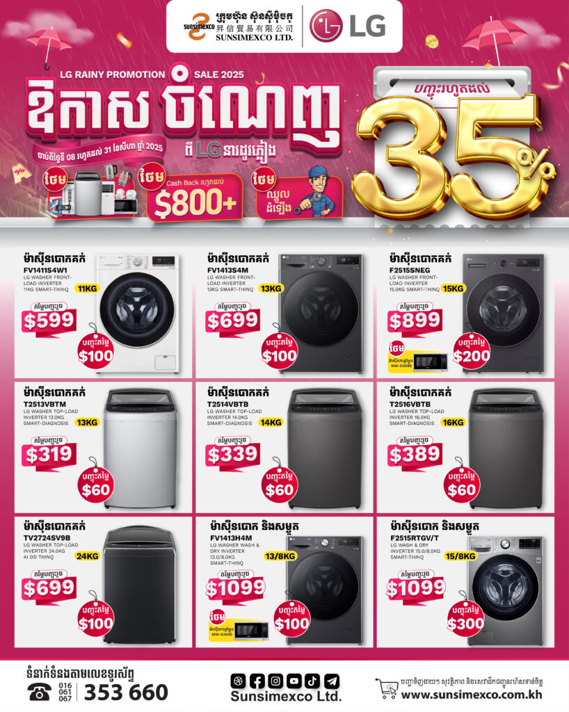 ឱកាសចំណេញពីម៉ាកLGនារដូវភ្លៀងនេះបញ្ចុះតម្លៃរហូតដល់៨០០ដុល្លារពីក្រុមហ៊ុនស៊ុនស៊ីម៉ិចកូ លើគ្រឿងអេឡិចត្រូនិចម៉ាក LG ជាពិសេស ម៉ាស៊ីនបោក និង ទូទឹកកក ក្នុងឱកាសប្រូម៉ូសិននារដូវភ្លៀងនេះអតិថិជននឹងទទួលបានការថែមជូនកាដូជាច្រើនភ្លាមៗដូចជា៖
