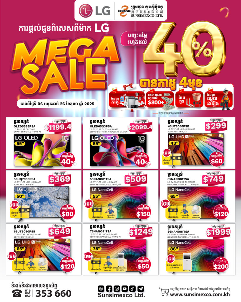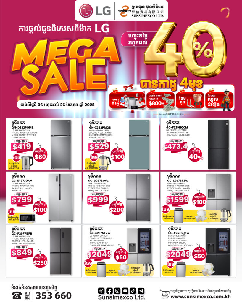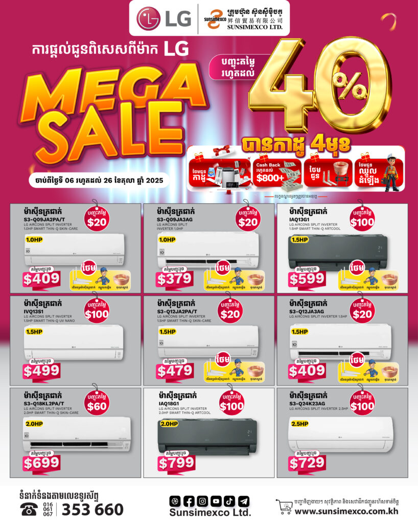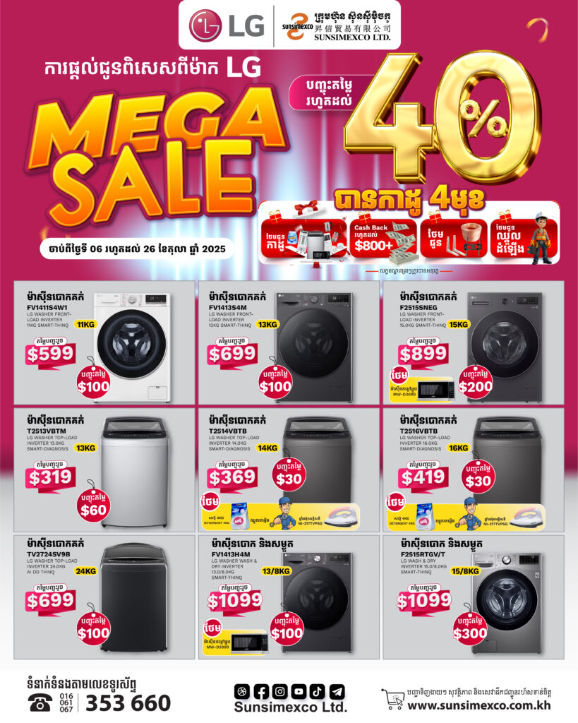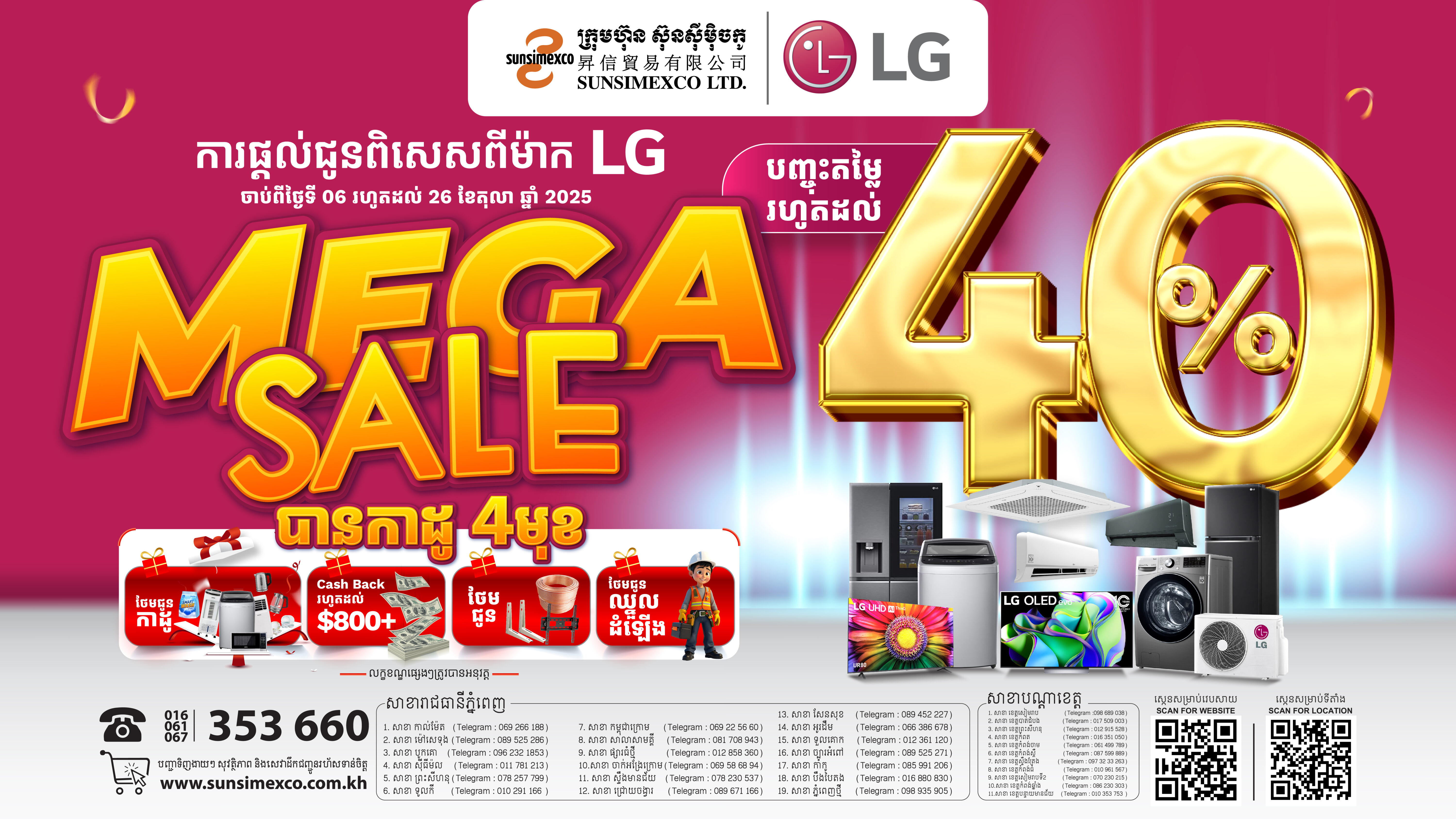 រាល់អតិថិជនធ្វើការជាវគ្រឿងអេឡិចត្រូនិចម៉ាក LG គ្រប់ប្រភេទទាំងអស់ពីសាខាណាមួយរបស់ក្រុមហ៊ុនស៊ុនស៊ីម៉ិចកូជាពិសេសគឺជាវម៉ាស៊ីនត្រជាក់ និងទូរទស្សន៍អតិថិជននឹងទទួលបានការលក់បញ្ចុះតម្លៃរហូតដល់ ៤០% ទៅលើមុខទំនិញដែលបានកំណត់ទុក រួមទាំងទទួលបានកាដូរហូតដល់ ៤មុខ ដូចជា៖