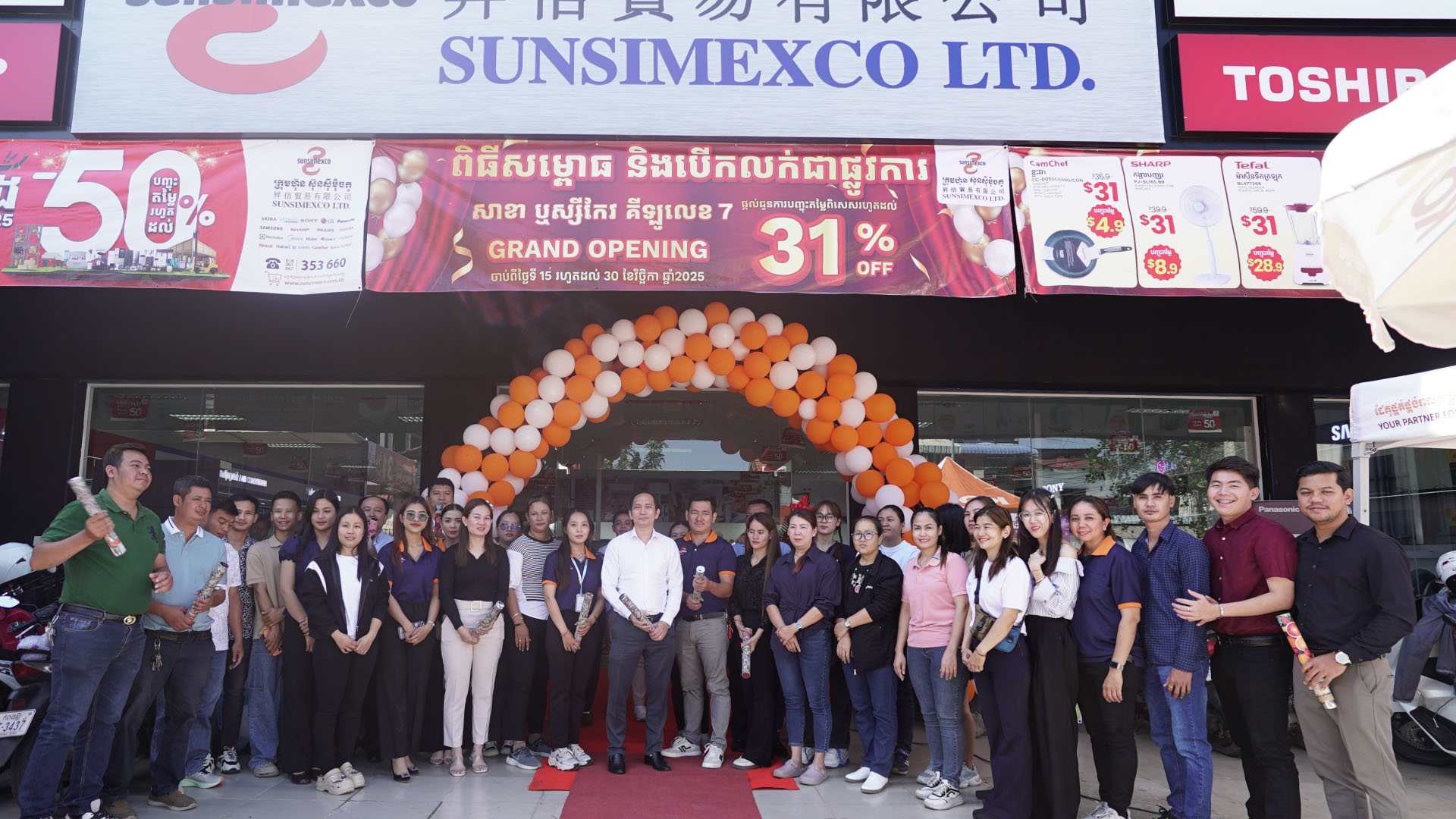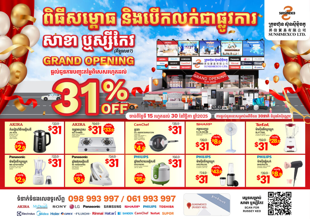 អបអរសាទរក្រុមហ៊ុនស៊ុនស៊ីម៉ិចកូបើកសម្ពោធសាខា ទី31 នៅឬស្សីកែវគីឡូលេខ7 នៅក្នុងកម្មវិធីនេះដែលក្រុមហ៊ុនបានរៀបចំប្រូម៉ូសិនយ៉ាងពិសេសរាល់អតិថិជនដែលបានមកជាវផ្ទាល់នឹងទទួលបានការលក់បញ្ចុះតម្លៃរហូតដល់ 31% និងមានទំនិញជាច្រើនមុខដែលលក់ក្នុងតម្លៃត្រឹមតែ 31$ តែប៉ុណ្ណោះរួមទាំងថែមជូននូវកាដូជាច្រើនមុខថែមទៀតផង។