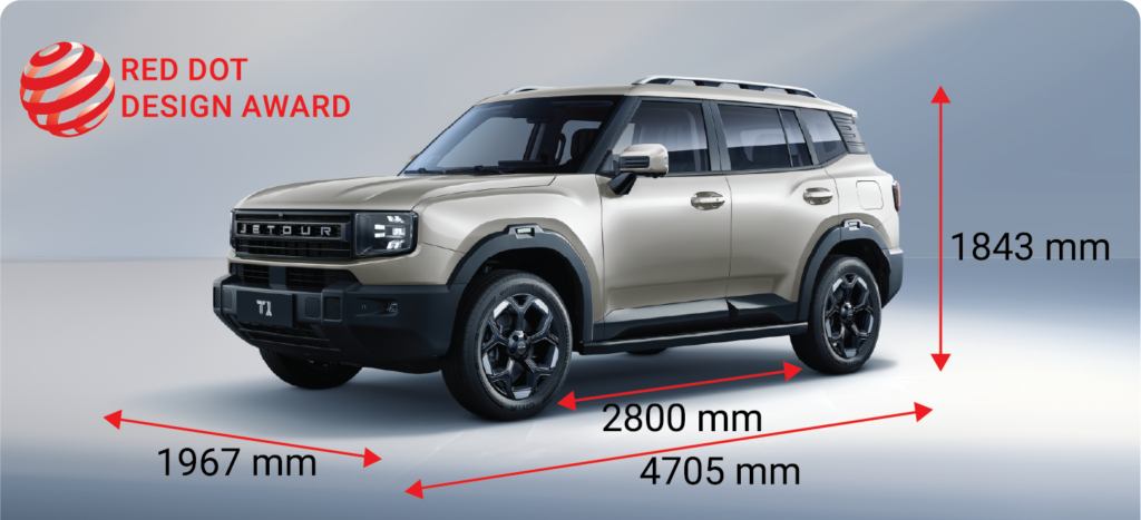 ផ្នែកខាងក្រៅរបស់រថយន្ត Jetour T1 មានការរចនាយ៉ាងប្រណីតជាមួយរូបរាងបែបជ្រុងលាយមូលរំលេចជាមួយនិងចង្កៀងLED ទម្រង់បែបសន្លឹកផ្កាបែបបួនស្រទាប់ តំណាងអោយ សំណាងល្អ។ រថយន្តមានកម្ពស់ខ្ពស់1843mm បណ្តោយ 4705mm, ទទឹង 1967mm ។