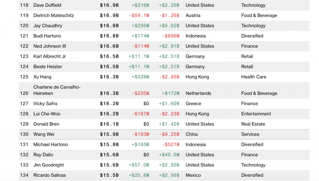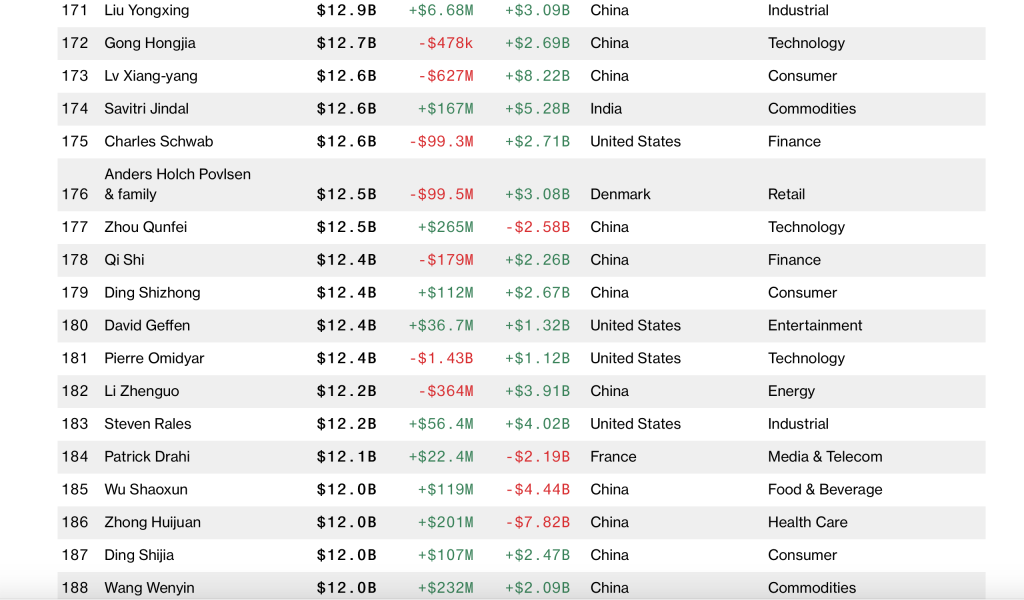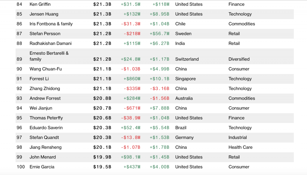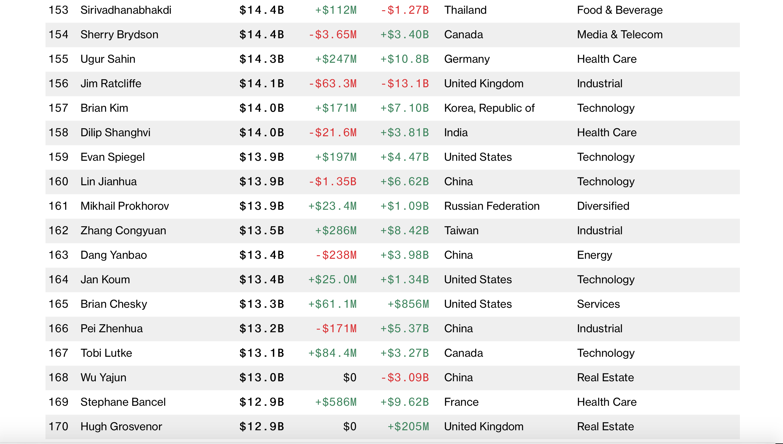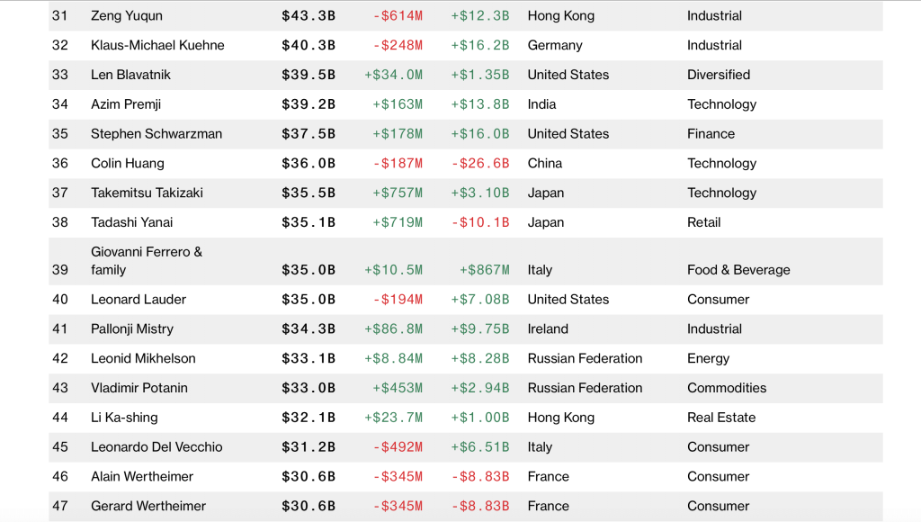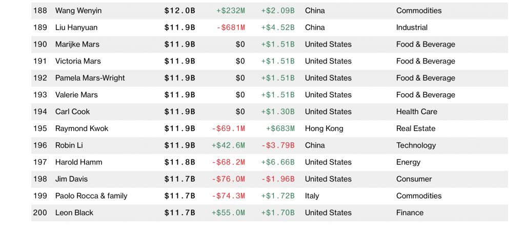 ខាងក្រោមនេះបញ្ជីឈ្មោះមហាសេដ្ឋីលើពិភពលោកទាំង ២០០ រូប កំពុងរកស៊ីធ្វើជំនួញលើផ្នែកផ្សេងៗគ្នា៖