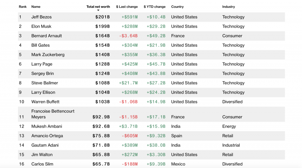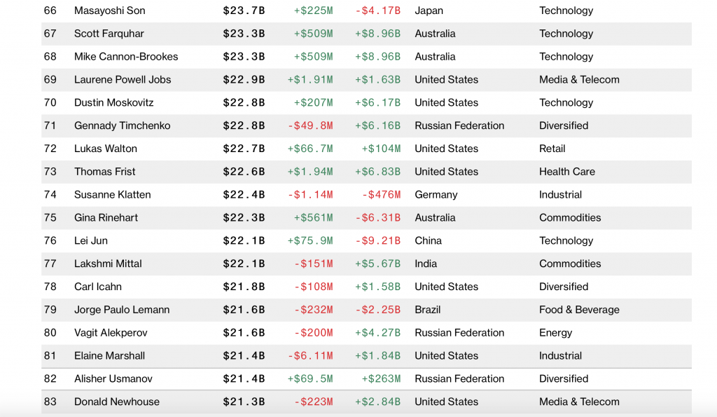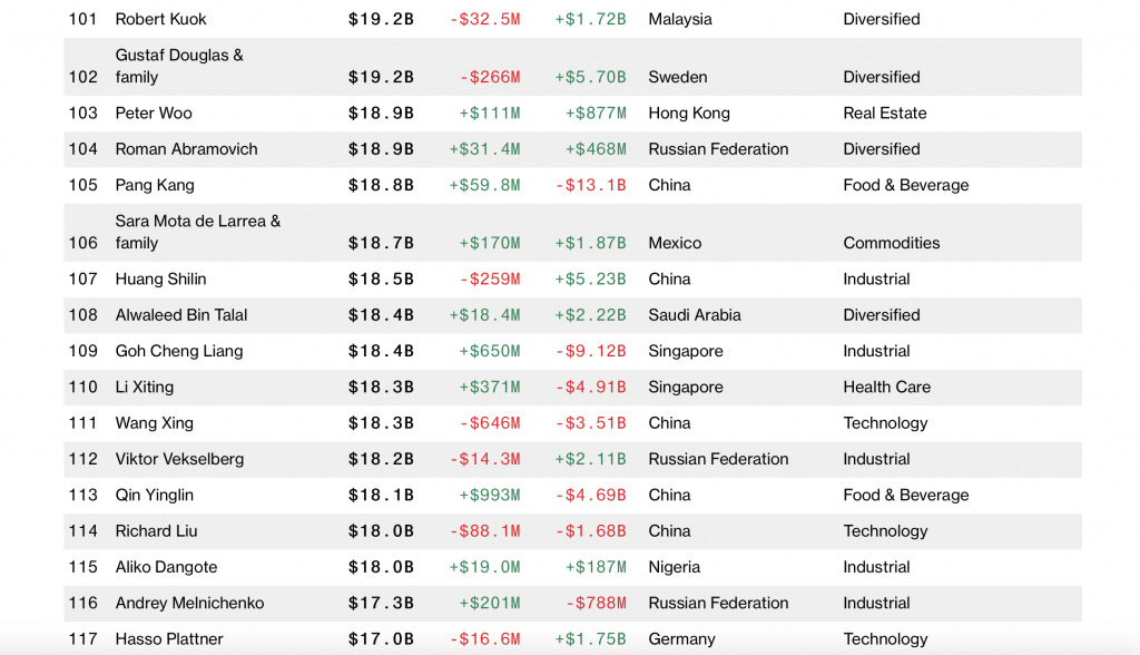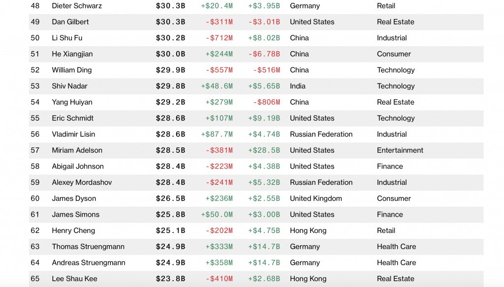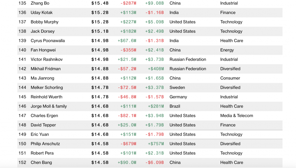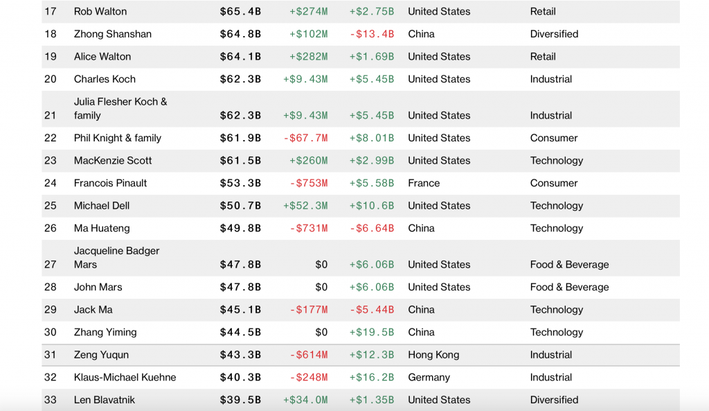ខាងក្រោមនេះបញ្ជីឈ្មោះមហាសេដ្ឋីលើពិភពលោកទាំង ២០០ រូប កំពុងរកស៊ីធ្វើជំនួញលើផ្នែកផ្សេងៗគ្នា៖