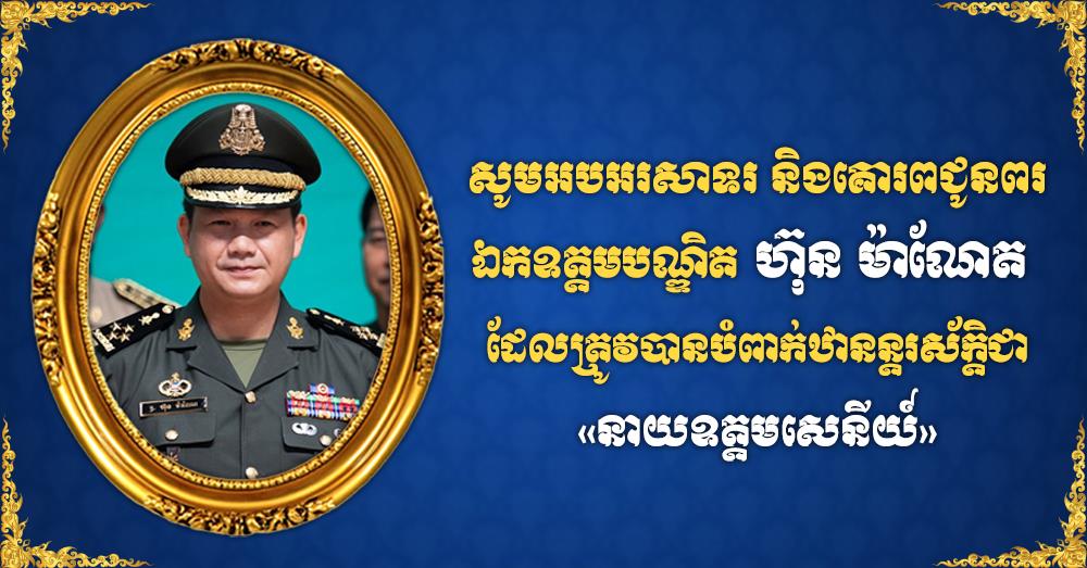 កាលពីថ្ងៃទី១៧ ខែមីនា ឆ្នាំ២០២៣ ព្រះករុណា ព្រះបាទសម្តេច ព្រះបរមនាថ នរោត្តម សីហមុនី ព្រះមហាក្សត្រ នៃព្រះរាជាណាចក្រកម្ពុជា បានចេញព្រះរាជក្រឹត្យត្រាស់បង្គាប់ដំឡើងឋានន្តរស័ក្តិ «នាយឧត្តមសេនីយ៍» ជូនដល់ ឯកឧត្តម ឧត្តមសេនីយ៍ឯក ហ៊ុន ម៉ាណែត នាយទាហានថ្នាក់ឧត្តមសេនីយ៍ នៃកងយោធពលខេមរភូមិន្ទ៕