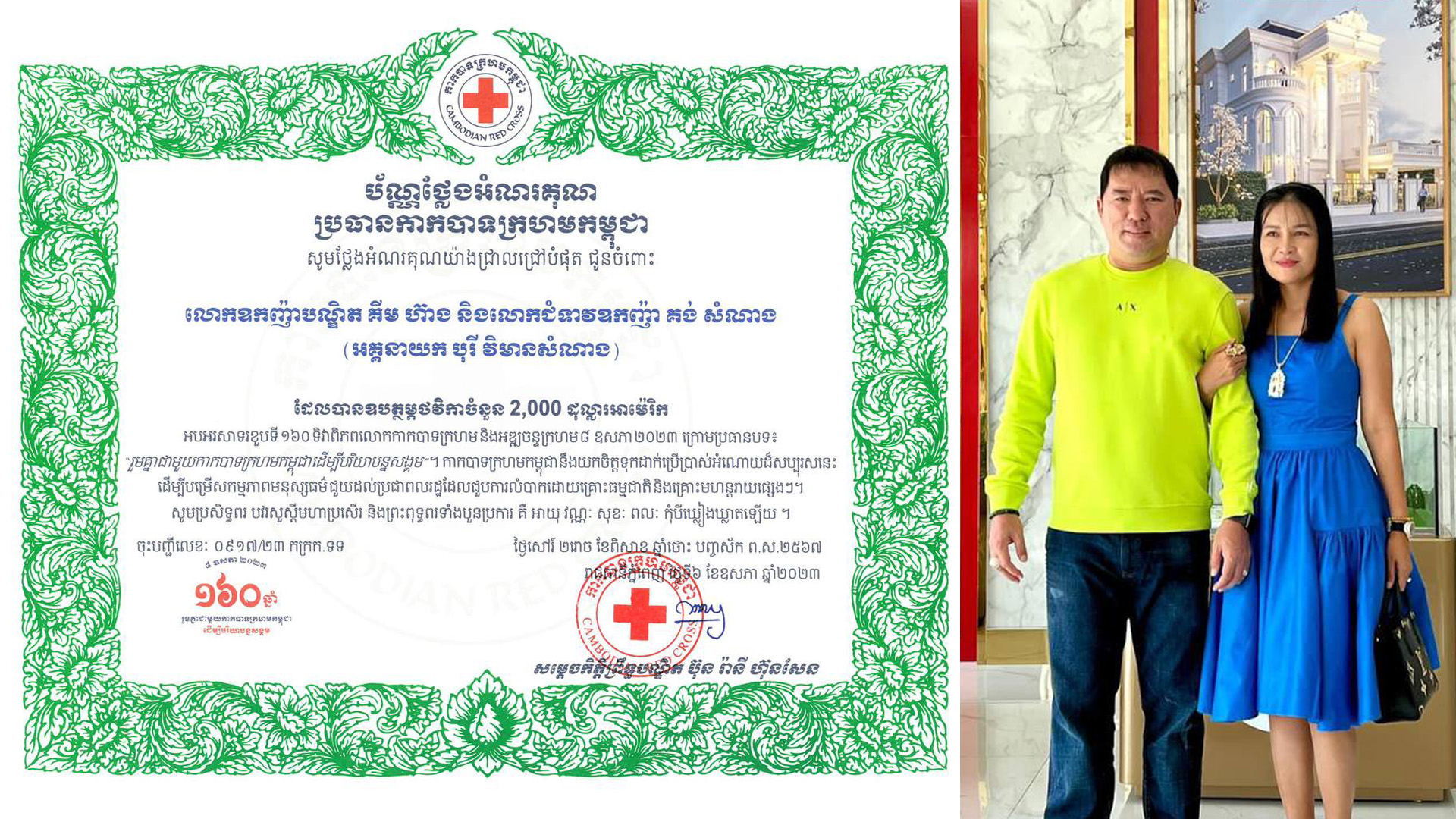 ឧកញ៉ាបណ្ឌិត គីម ហ៊ាង និងភរិយា ឧបត្ថម្ភថវិកាចំនួន ២០០០ដុល្លារ ជូនកាកបាទក្រហមកម្ពុជា