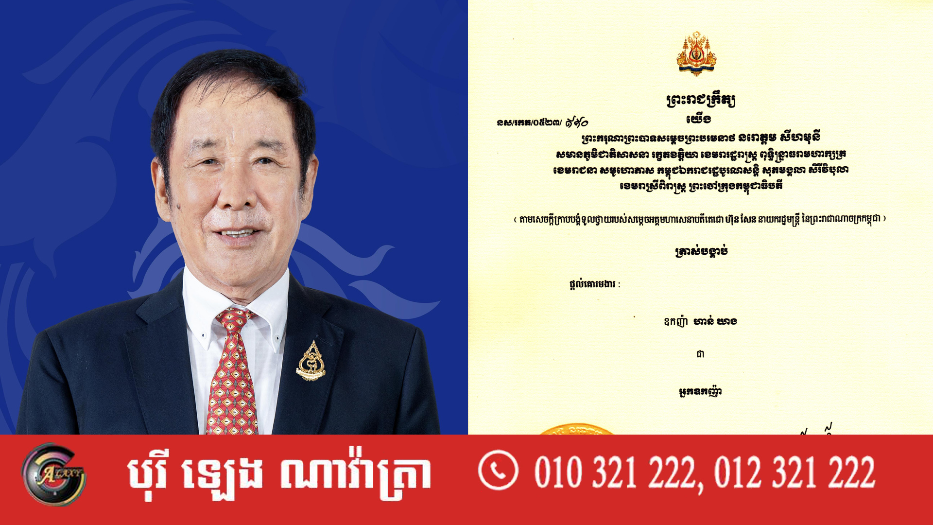 ព្រះករុណាព្រះបាទសម្តេចព្រះបរមនាថ នរោត្តម សីហមុនី ព្រះមហាក្សត្រនៃព្រះរាជាណាចក្រកម្ពុជា បានចេញព្រះរាជក្រឹត្យត្រាស់បង្គាប់ផ្តល់គោរមងារ «អ្នកឧកញ៉ា» ជូនដល់ ឧកញ៉ា ហាន់ ឃាង អនុប្រធានសមាគមឧកញ៉ាកម្ពុជា កាលពីថ្ងៃទី២៥ ខែឧសភា ឆ្នាំ២០២៣ តបតាមសេចក្តីក្រាបបង្គំទូលថ្វាយរបស់ សម្តេចអគ្គមហាសេនាបតីតេជោ ហ៊ុន សែន នាយករដ្ឋមន្ត្រីនៃព្រះរាជាណាចក្រកម្ពុជា។