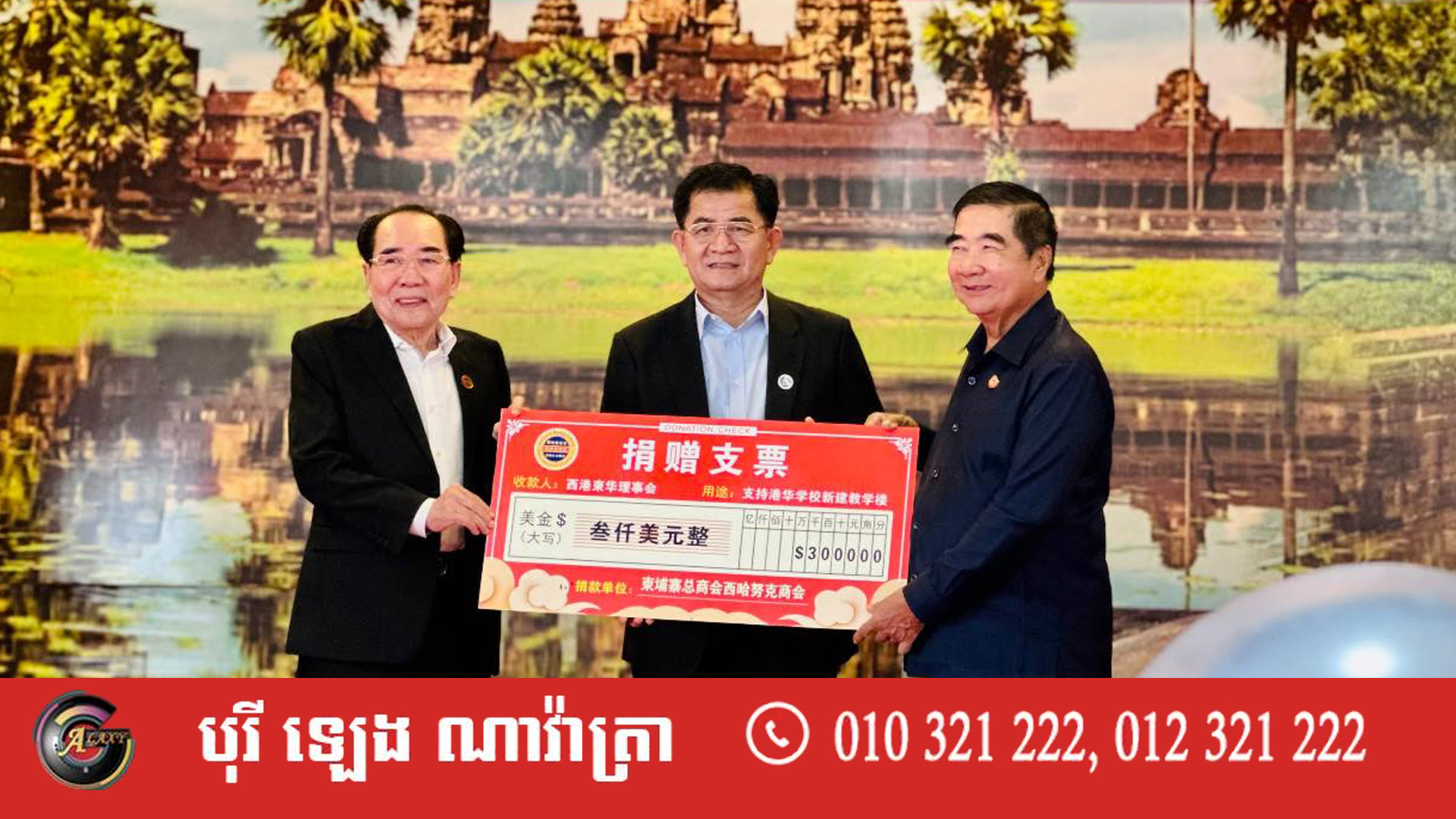 ជារួម លោកឧកញ៉ាទាំង៣រូប បានឧបត្ថម្ភ ៦ពាន់ដុល្លារ និងសរុបពីសប្បុរសជនទាំងអស់ រួមទាំងសភាពាណិជ្ជកម្មខេត្តព្រះសីហនុ គឺបានថវិកាសរុបប្រមាណ ១១,៥០០ ដុល្លារសហរដ្ឋអាមេរិក។ សាលារៀន កាង ហួរ ជាសាលាចិនសាធារណៈតែមួយគត់នៅក្រុងព្រះសីហនុ ខេត្តព្រះសីហនុ ដែលបង្កើតឡើងដោយសមាគមខ្មែរចិនខេត្តព្រះសីហនុ ហើយការចូលរួមឧបត្ថម្ភសាលានេះ ក៏ជាការចូលរួមចំណែកជួយដល់សង្គម តាមរយៈការលើកទឹកចិត្ត និងលើកកម្ពស់ជួយបង្កើតធនធានមនុស្សជំនាន់ក្រោយ ឱ្យបានកាន់តែច្រើនឡើង ដើម្បីចូលរួមអភិវឌ្ឍប្រទេសជាតិ។