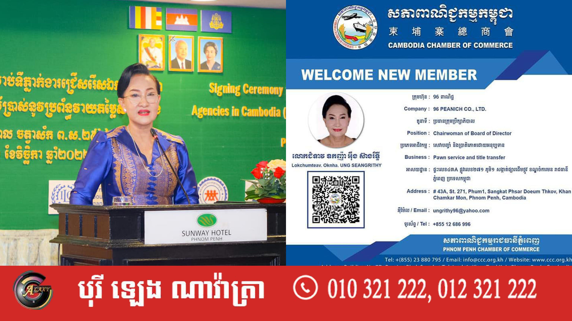 លោកជំទាវឧកញ៉ា អុឹង ស៊ាងរិទ្ធី ប្រធានក្រុមប្រឹក្សាភិបាលក្រុមហ៊ុន 96 ពាណិជ្ជ (96 Peanich Co., Ltd) បានក្លាយជាសមាជិកថ្មី នៃសភាពាណិជ្ជកម្មកម្ពុជា។ នេះបើតាមសេចក្តីប្រកាសព័ត៌មានរបស់សភាពាណិជ្ជកម្មកម្ពុជា នៅព្រឹកថ្ងៃទី១៤ ខែមិថុនា ឆ្នាំ២០២៣នេះ។
