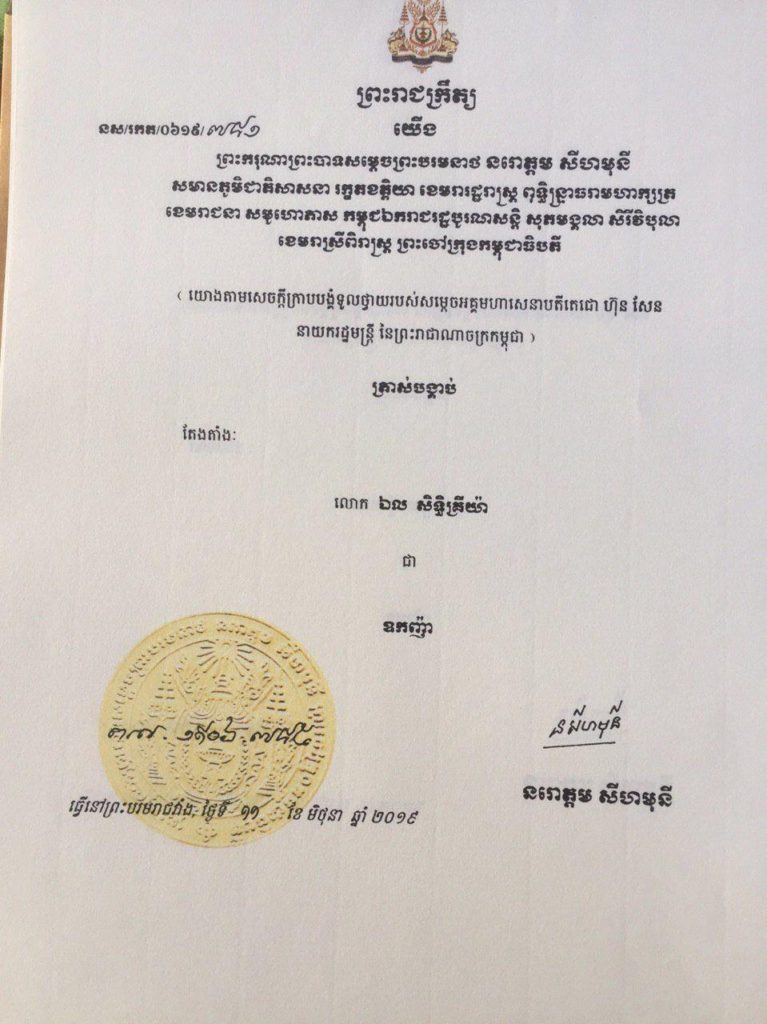 យោងតាមព្រះរាជក្រឹត្យចុះថ្ងៃទី១១ ខែមិថុនា ឆ្នាំ២០១៩ បានបញ្ជាក់ថា យោងតាមសេចក្តីក្រាបបង្គំទួលថ្វាយរបស់សម្តេចអគ្គមហាសេនាបតីតេជោហ៊ុន សែន នាយករដ្ឋមន្ត្រីនៃព្រះរាជាណាចក្រកម្ពុជា ។ ព្រះអង្គបានសព្វព្រះរាជហរទ័យ បានត្រាស់បង្គាប់តែងតាំង លោកឯល សិទ្ធិគ្រីយ៉ា ជា ឧកញ៉ា។