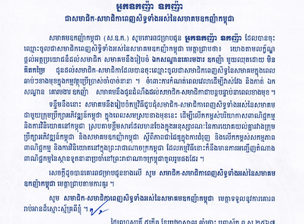 ទទឹមនឹងនោះ ក្នុងលិខិតខាងលើ ក៏បានឱ្យដឹងបន្ថែមទៀតថា សមាគមឧកញ៉ាកម្ពុជា នឹងរៀបចំកម្មវិធីជួបជុំសមាជិក-សមាជិកាពេញសិទ្ធិទាំងអស់ ជាមួយក្រុមប្រឹក្សាអភិវឌ្ឍន៍កម្ពុជា ក្នុងពេលសមស្របខាងមុខនេះ ដើម្បីលើកកម្ពស់បរិយាកាសពាណិជ្ជកម្ម និងការវិនិយោគនៅកម្ពុជា ស្របតាមខ្លឹមសារដែលមានចែងក្នុងអនុស្សរណៈនៃការយោគយល់គ្នារវាងភាគីទាំងពីរ បានចុះហត្ថលេខាព្រមព្រៀងគ្នា នាពេលថ្មីៗកន្លងមក។