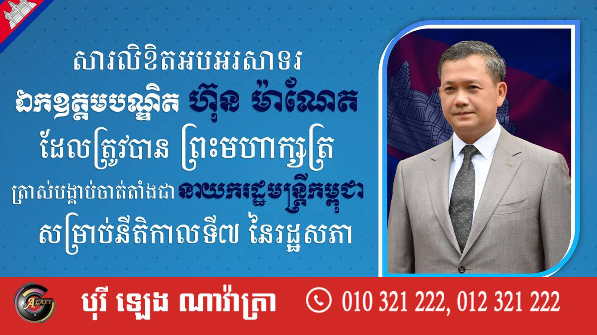 លោកឧកញ៉ា សំ សុខនឿន ប្រធានសមាគមអចលនទ្រព្យសកល អគ្គនាយកក្រុមហ៊ុន SAM SN REALTY និងលោកជំទាវ សូមអបអរសាទរដោយស្មោះជូនចំពោះ ឯកឧត្តមបណ្ឌិត ហ៊ុន ម៉ាណែត ដែលត្រូវបានព្រះករុណា ព្រះបាទសម្តេចព្រះបរមនាថ នរោត្តម សីហមុនី ព្រះមហាក្សត្រនៃកម្ពុជា ត្រាស់បង្គាប់ចាត់តាំងជា «នាយករដ្ឋមន្ត្រី នៃព្រះរាជាណាចក្រកម្ពុជា» សម្រាប់នីតិកាលទី៧ នៃរដ្ឋសភា នៅថ្ងៃទី ០៧ ខែសីហា ឆ្នាំ២០២៣នេះ។
