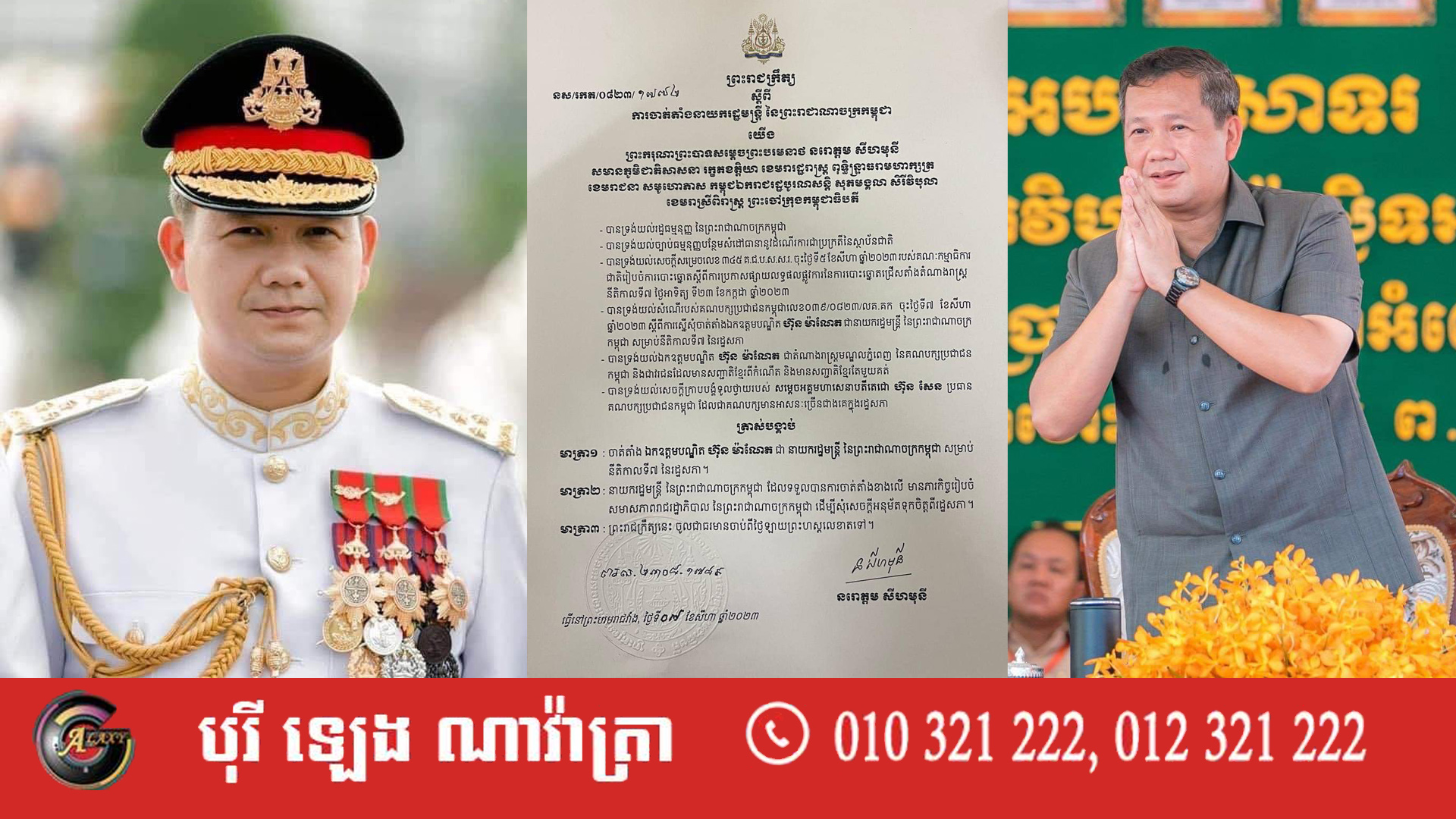 អ្នកឧកញ៉ា សួរ វីរៈ អគ្គនាយកក្រុមហ៊ុន វិរៈប៊ុនថាំ អេចប្រេស និងលោកជំទាវ សូមអបអរសាទរដោយស្មោះជូនចំពោះ ឯកឧត្តមបណ្ឌិត ហ៊ុន ម៉ាណែត ដែលត្រូវបានព្រះករុណា ព្រះបាទសម្តេចព្រះបរមនាថ នរោត្តម សីហមុនី ព្រះមហាក្សត្រនៃកម្ពុជា ត្រាស់បង្គាប់ចាត់តាំងជា «នាយករដ្ឋមន្ត្រី នៃព្រះរាជាណាចក្រកម្ពុជា» សម្រាប់នីតិកាលទី៧ នៃរដ្ឋសភា នៅថ្ងៃទី ០៧ ខែសីហា ឆ្នាំ២០២៣នេះ។