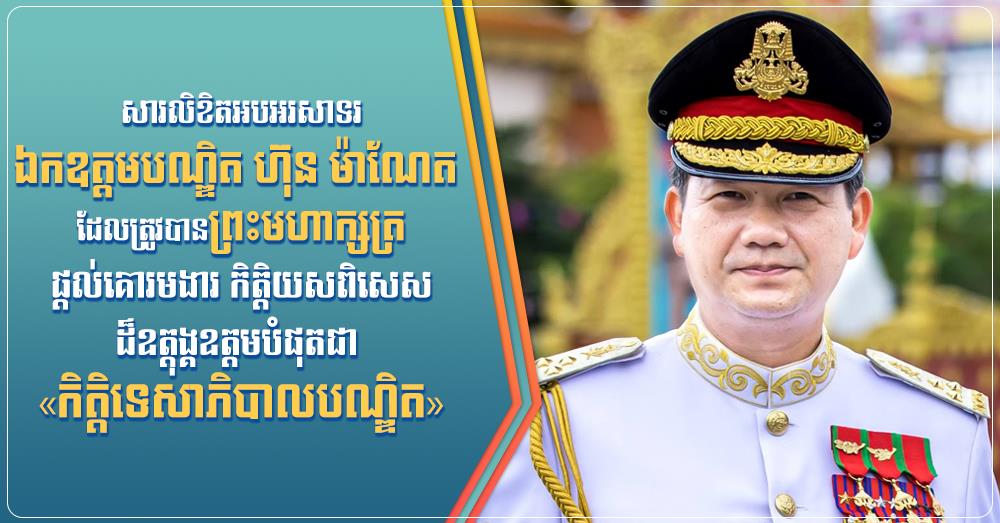 ឯកឧត្តមកិត្តិទេសាភិបាលបណ្ឌិត ហ៊ុន ម៉ាណែត ពិតជាស័ក្តិសមបំផុត ចំពោះការទទួលបាននូវគោរមងារកិត្តិយសពិសេសដ៏ឧត្តុង្គឧត្តមបំផុត នៃរាជបណ្ឌិត្យសភាកម្ពុជា ជា «កិត្តិទេសាភិបាលបណ្ឌិត» នេះ ដោយឯកឧត្តមកិត្តិទេសាភិបាលបណ្ឌិត មានគុណបំណាច់ដ៏ថ្លៃថ្លា និងស្នាដៃដ៏ត្រចះត្រចង់ ក្នុងនាមជាយុវជនជំនាន់ថ្មី និងជាឥស្សរជនដឹកនាំដ៏ឆ្នើម របស់ព្រះរាជាណាចក្រកម្ពុជា ដែលពោរពេញទៅដោយសមត្ថភាព និងទេពកោសល្យខ្ពស់ ព្រមទាំងមានគុណធម៌ សីលធម៌ ព្រហ្មវិហារធម៌ ជាពិសេសបាននឹងកំពុងដឹកនាំ ធ្វើសកម្មភាពជាគម្រូ ជាក់ស្ដែងជាច្រើនឆ្នាំមកហើយ ទៅលើវិស័យសំខាន់ៗ ដើម្បីបុព្វហេតុ ជាតិ សាសនា និងព្រះមហាក្សត្រ។
