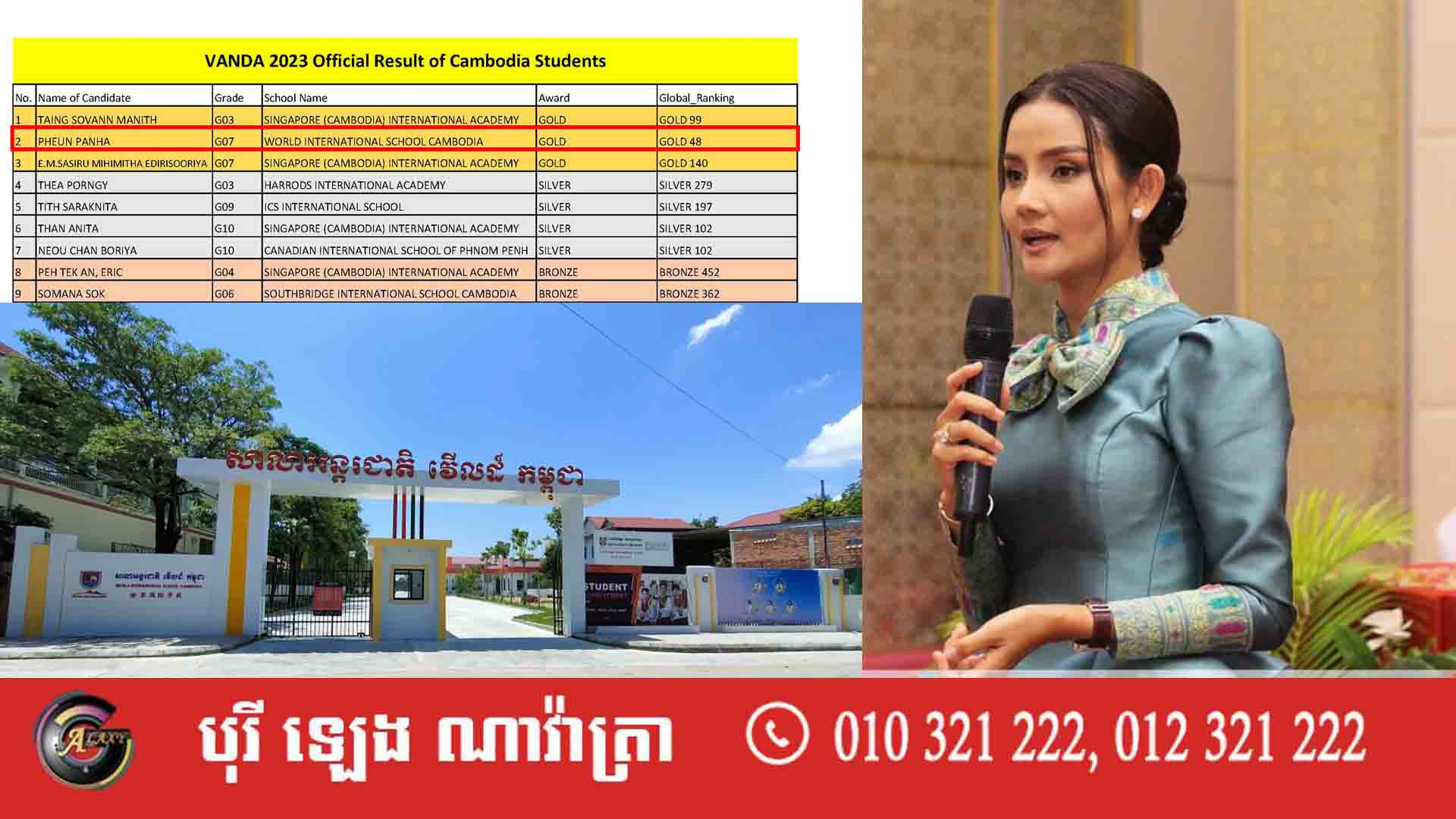 សិស្សឆ្នើមថ្នាក់ទី៧ នៃសាលាអន្តរជាតិ វើលដ៍កម្ពុជា ឈ្មោះ ភឺន បញ្ញា ដណ្ដើមបានមេដាយលេខ១ ទូទាំងប្រទេស និងទទួលចំណាត់ថ្នាក់លេខ ៤៨ ទូទាំងពិភពលោក នៅក្នុងការប្រកួតអន្តរជាតិ VANDA2023 International Science Competition ដោយមានអ្នកចូលរួមជិត ៤,០០០ នាក់ មកពី២០ ប្រទេស។