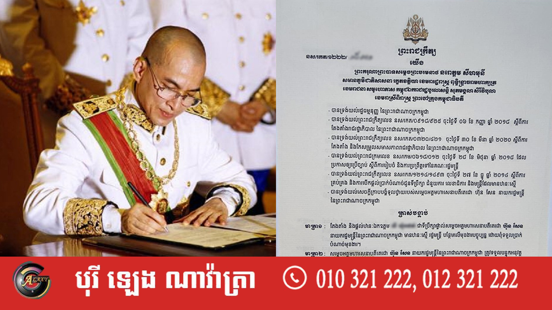 កាលពីថ្ងៃទី៦ ខែកញ្ញា ឆ្នាំ២០២៣ ម្សិលមិញនេះ សម្តេចវិបុលសេនាភក្តី សាយ ឈុំ ក្នុងព្រះបរមនាមនិងតាមព្រះរាជត្រាស់បង្គាប់ ប្រមុខរដ្ឋស្តីទី តាមសេចក្តីក្រាបបង្គំទូលថ្វាយរបស់ សម្តេចធិបតី ហ៊ុន ម៉ាណែត នាយករដ្ឋមន្ត្រីកម្ពុជា បានចេញព្រះរាជក្រឹត្យ ស្តីពីគោលការណ៍សម្រាប់ការតែងតាំងទីប្រឹក្សា និងជំនួយការ នៅក្នុងអង្គការនីតិប្រតិបត្តិ។