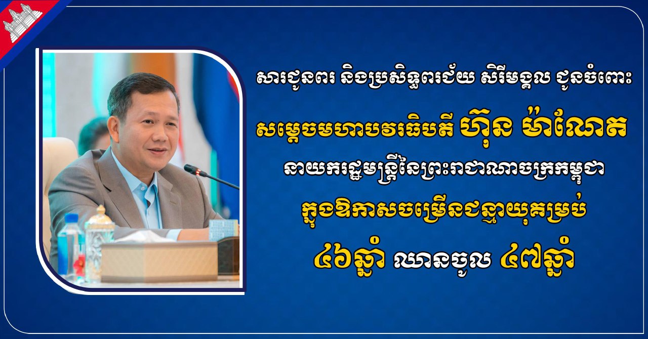 ស្ថិតក្នុងឱកាសដ៏មហោឡារិក ប្រកបដោយក្តីសោមនស្សរីករាយនេះ យើងខ្ញុំទាំងអស់គ្នា សូមគោរពជូនពរ សម្តេចមហាបវរធិបតី និងលោកជំទាវ ព្រមទាំងបុត្រ សូមប្រកបដោយសុខភាពល្អបរិបូរណ៍ កម្លាំងពលំមាំមួន ជន្មាយុយឺនយូរ បញ្ញាញាណវាងវៃ ដើម្បីបន្តបេសកកម្មដ៏ឧត្តុង្គឧត្តម បម្រើជាតិមាតុភូមិដ៏បវរនៃយើង និងសូមប្រកបដោយពុទ្ធពរទាំងបួនប្រការគឺ អាយុ វណ្ណៈ សុខៈ និងពលៈ កុំបីឃ្លៀងឃ្លាតឡើយ៕