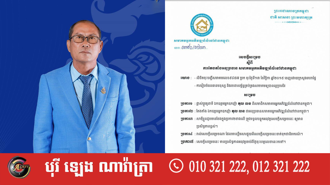 អ្នកឧកញ៉ា លី ហួរ ប្រធានសមាគមអ្នកអភិវឌ្ឍន៍លំនៅឋានកម្ពុជា កាលពីថ្ងៃទី០៣ ខែវិច្ឆិកា ឆ្នាំ២០២៣ បានចេញសេចក្តីសម្រេចផ្លាស់ប្តូរនិងតែងតាំង អ្នកឧកញ៉ា តុល លន ពីសមាជិកទៅជា «អនុប្រធាន» សមាគមអ្នកអភិវឌ្ឍន៍លំនៅឋានកម្ពុជា។