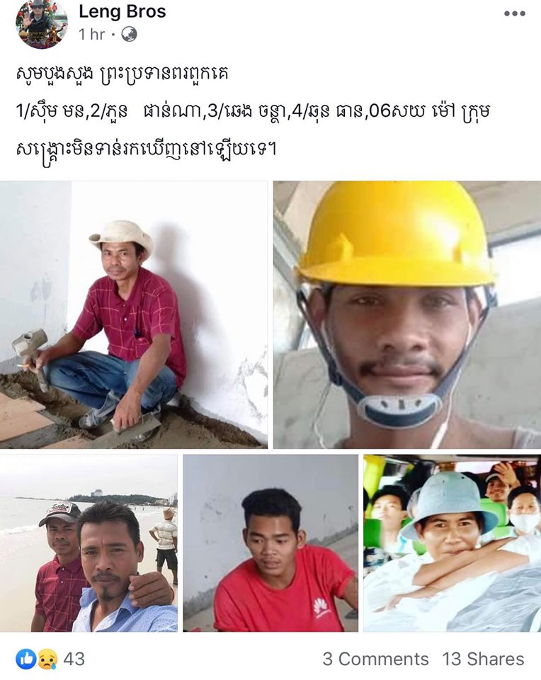 អ្នកភូមិ របស់លោក ឧកញ៉ា ឡេងណាវ៉ាត្រា ដែលបានទៅធ្វើជាកម្មករនៅ អាគារដែលរលំបាក់ខាងលើមានរហូតដល់៥នាក់ 1/សុឹម មន,2/ភួន ផាន់ណា,3/ឆេង ចន្ថា,4/ឆុន ធាន,៥ សយ ម៉ៅ គិតមកដល់ម៉ោងនេះ ក្រុមសង្គ្រោះមិនទាន់រកឃើញនៅឡើយទេ។
