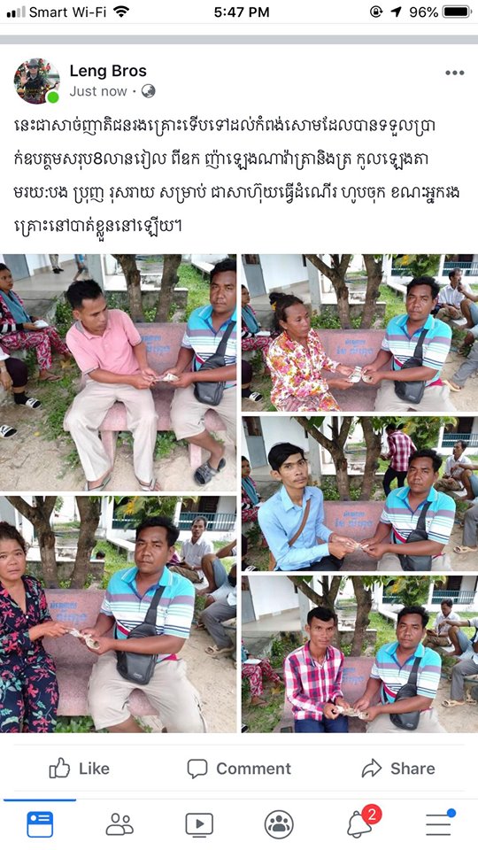 បើតាម ការបញ្ជាក់ពី លោក ឡេង ប្រុស បងបង្កើត ឧកញ៉ា ឡេងណាវ៉ាត្រានេះជាសាច់ញាតិជនរងគ្រោះទើបទៅដល់កំពង់សោមដែលបានទទួលប្រាក់ឧបត្ថមសរុប8លានរៀល ពីឧក ញ៉ាឡេងណាវ៉ាត្រានិងត្រ កូលឡេងតាមរយ:បង ប្រុញ រុសរាយ សម្រាប់ ជាសាហ៊ុយធ្វើដំណើរ ហូបចុក ខណៈអ្នករងគ្រោះនៅបាត់ខ្លួននៅឡើយ។