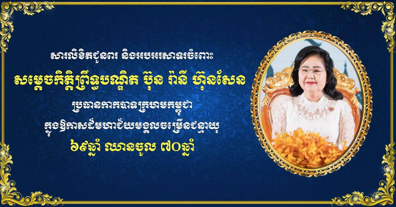 យើងខ្ញុំទាំងអស់គ្នា សូមអនុញ្ញាតសម្តែងនូវសោមន្សរីករាយ ដោយស្មោះអស់ពីដួងចិត្ត និងចូលរួមជូននូវសព្ទសាធុការពរជ័យ បវរមហាប្រសើរគោរពជូន សម្តេចកិត្តិព្រឹទ្ធបណ្ឌិត សូមប្រកបដោយសុខភាពល្អបរិបូរណ៍ កម្លាំងពលំមាំមួន អាយុយឺនយូរ និងប្រាជ្ញាឈ្លាសវៃ ដើម្បីដឹកនាំកាកបាទក្រហមកម្ពុជា ឱ្យសម្រេចបាននូវលទ្ធផលផ្លែផ្កាថ្មីៗជាច្រើនថែមទៀត ដែលជាបេសកកម្មដ៏ឧត្តុង្គឧត្តមរបស់ សម្តេចកិត្តិព្រឹទ្ធបណ្ឌិត ចំពោះប្រជាជន និងជាតិមាតុភូមិកម្ពុជា។