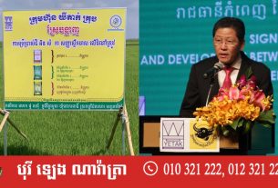 ឆ្វេង៖ ឧកញ៉ា សេង ញ៉ក ពាក់អាវស កំពុងពិនិត្យឯកសារ