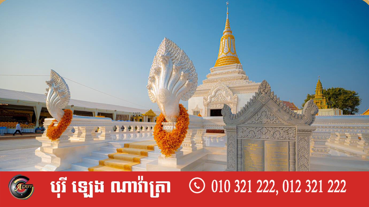ប្រភពខាងលើ បានបញ្ជាក់ថា ប្រាង្គចេតិយដ៏ប្រណិតនេះ ត្រូវបានសាងសង់ឡើងដោយប្រើប្រាស់នូវការ៉ូម៉ាបមានប្រភពមកប្រទេសអុីតាលី ផ្ទៃខាងក្នុងចេតិយមានរូបគំនូរពុទ្ធប្រវត្តិ ចំណែកឯតួប្រាង្គចេតិយ បិទដោយសន្លឹកមាស និងប្រាក់ ភ្លឺចែងចាំង ប្រកបដោយសោភ័ណភាពដ៏លេចធ្លោ។ ព័ទ្ធជុំវិញខាងក្រោមជើងប្រាង្គចេតិយ មានក្រាលកំរ៉ាលថ្មក្រានីត និងចុងខឿនក្រានីតមានដាក់ចង្អូរទឹកក្រាលទម្រដែកក្រាស់មិនច្រេះ (Stainless Steel) និងដាក់ត្បូងលម្អ នាំចូលពីប្រទេសអាហ្រ្វិក អមដោយមាសស្រួយ មានបង្កប់ភ្លើងបំភ្លឺ LED និងគ្របដោយគម្របកញ្ចក់កម្រាស់ ២០ ម.ម ដ៏រឹងមាំដើម្បីការពារ។