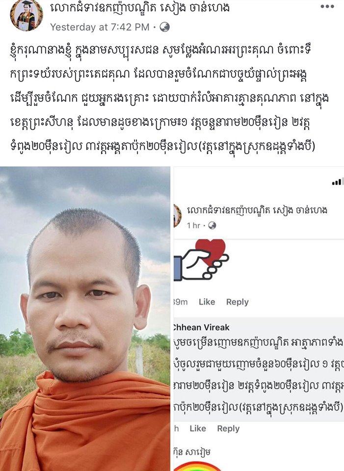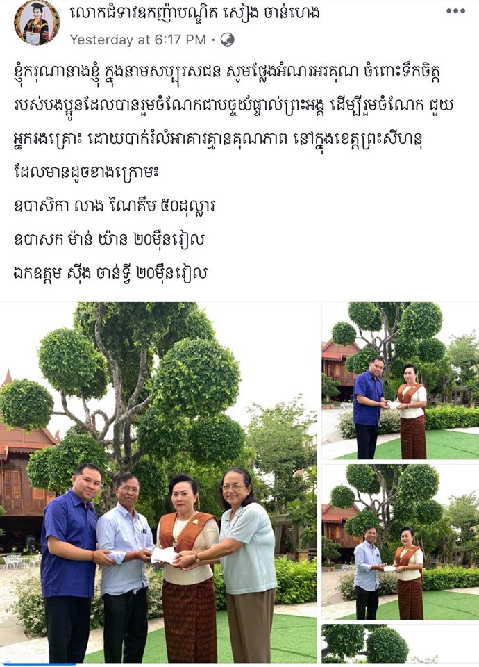 តាមរយៈផេក”លោកជំទាវឧកញ៉ាបណ្ឌិត សៀង ចាន់ហេង” ដែលជាផេកផ្លូវការរបស់លោកជំទាវបណ្ឌិត ព្រះសង្ឃ ព្រមទាំងពុទ្ធបរិស័ទ ដែលបានចូលរួមជួយដល់ជនរងគ្រោះដោយសាររលំអគារក្នុងខេត្តព្រះសីហនុ តាមរយៈលោកជំទាវឧកញ៉ាបណ្ឌិត សៀង ចាន់ហេង មានរាយនាមដូចខាងក្រោម៖