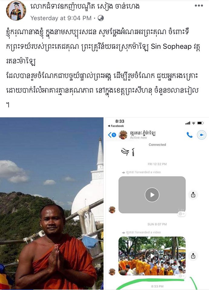 ៣/ ព្រះភិក្ខុ បេប សុភារម្យ ខេត្តព្រៃវែង ចំនួន២០ម៉ឺនរៀល