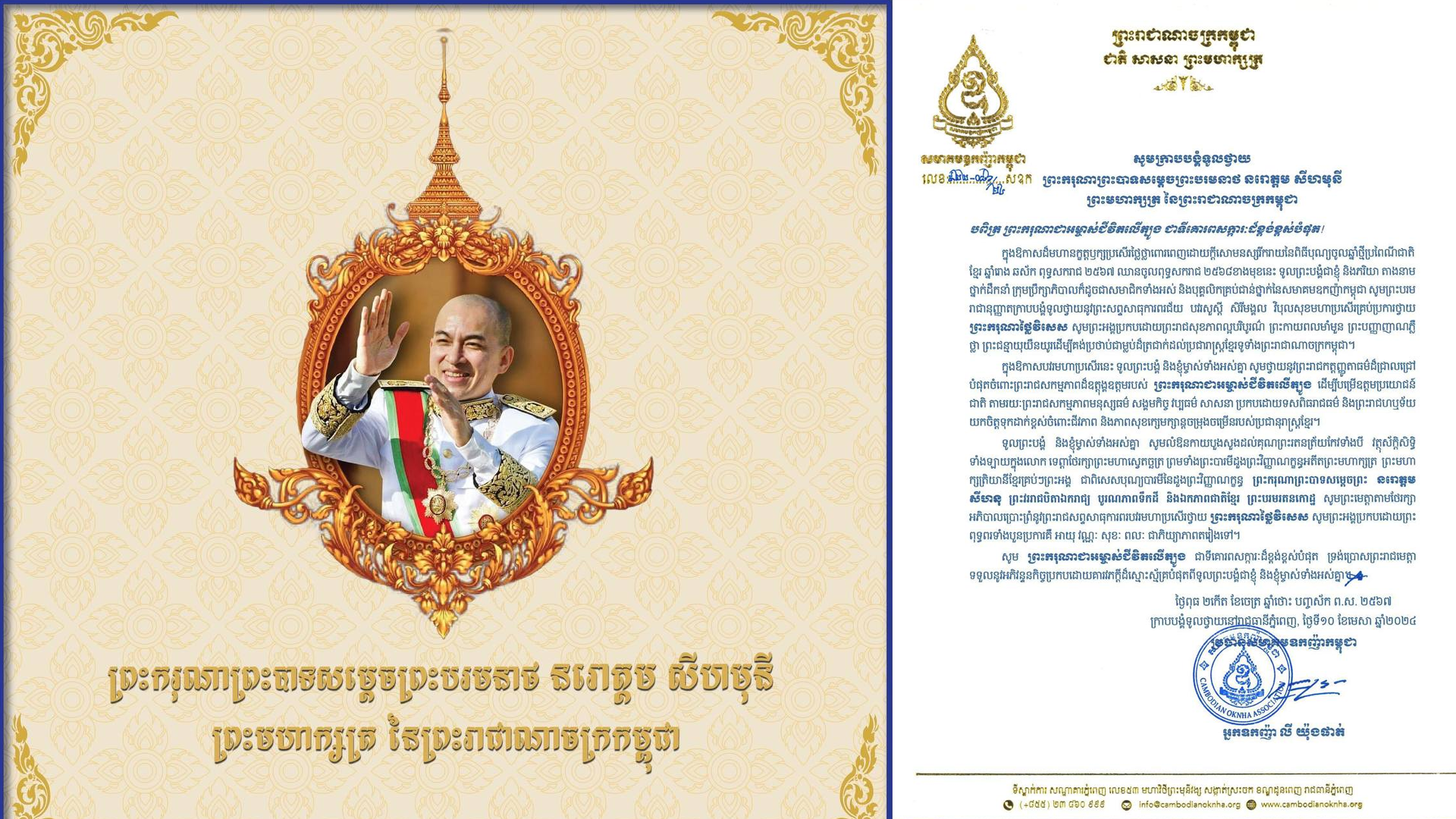 ក្នុងឱកាសបវរមហាប្រសើរនេះ ទូលព្រះបង្គំ និងខ្ញុំម្ចាស់ទាំងអស់គ្នា សូមថ្វាយនូវព្រះរាជកត្តញ្ញូតាធម៌ដ៏ជ្រាលជ្រៅ បំផុតចំពោះព្រះរាជសកម្មភាពដ៏ឧត្តុង្គឧត្តមរបស់ ព្រះករុណាជាអម្ចាស់ជីវិតលើត្បូង ដើម្បីបម្រើឧត្តមប្រយោជន៍ ជាតិ តាមរយៈព្រះរាជសកម្មភាពមនុស្សធម៌ សង្គមកិច្ច វប្បធម៌ សាសនា ប្រកបដោយទសពិធរាជធម៌ និងព្រះរាជហឫទ័យ យកចិត្តទុកដាក់ខ្ពស់ចំពោះជីវភាព និងភាពសុខក្សេមក្សាន្តចម្រុងចម្រើនរបស់ប្រជានុរាស្ត្រខ្មែរ។