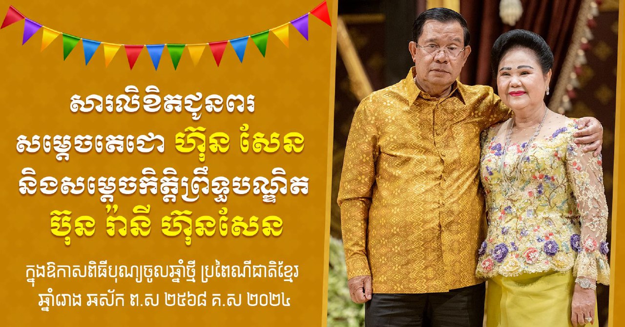 ក្នុងឱកាសដ៏មហាប្រសើរថ្លៃថ្លានៃពិធីបុណ្យចូលឆ្នាំថ្មីប្រពៃណីជាតិខ្មែរ ដែលប្រព្រឹត្តទៅចាប់ពីថ្ងៃទី១៣ ដល់ថ្ងៃទី១៦ ខែមេសា ឆ្នាំ២០២៤នេះ យើងខ្ញុំសូមលំឱនកាយវាចាចិត្តបួងសួង ដល់គុណបុណ្យព្រះរតនត្រ័យ វត្ថុស័ក្ដិសិទ្ធិក្នុងលោក ជាពិសេស ទេវតាឆ្នាំថ្មី ព្រះនាម មហោទរាទេវី សូមប្រទាននូវពរជ័យបវរមហាប្រសើរជូន សម្ដេចតេជោ និងសម្ដេចកិត្តិព្រឹទ្ធបណ្ឌិត សូមមានសុខភាពល្អបរិបូរណ៍ កម្លាំងពលំមាំមួន ប្រាជ្ញាភ្លឺថ្លា ជន្មាយុយឺនយូរ ឈ្នះអស់មារសត្រូវគ្រប់ទិសទី និងទទួលបានជោគជ័យថ្មីបន្ថែមទៀត ដើម្បីជាឧត្តមប្រយោជន៍ ចំពោះជាតិមាតុភូមិ និងប្រជាជន។