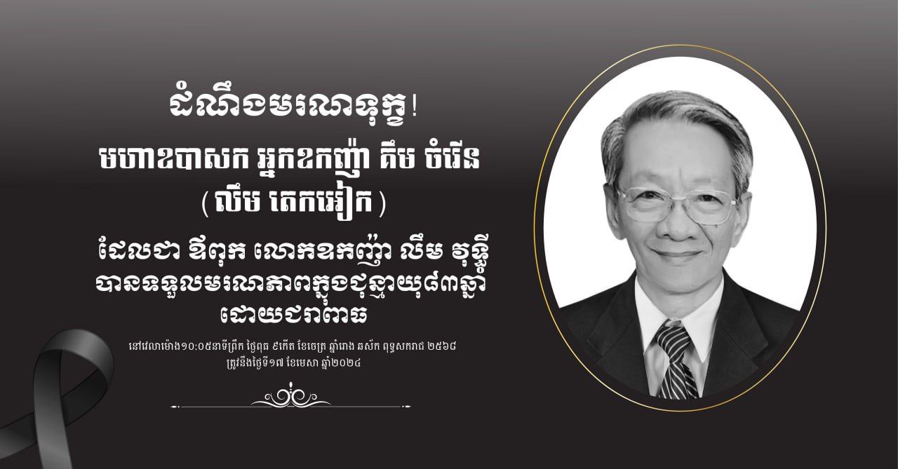 អ្នកឧកញ៉ា មហាឧបាសក គឹម ចំរើន (លីម តេកអៀក) ដែលត្រូវជាឪពុកបង្កើត លោកឧកញ៉ា លឹម វុទ្ធី និងជាឪពុកក្មេក អ្នកឧកញ៉ា លាង ម៉េង បានទទួលមរណភាពក្នុងជន្មាយុ៨៣ឆ្នាំ ដោយជរាពាធ។