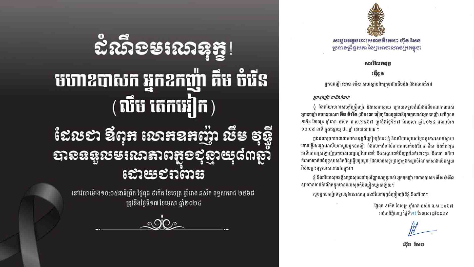សម្ដេចអគ្គមហាសេនាបតីតេជោ ហ៊ុន សែន ប្រធានព្រឹទ្ធសភានៃព្រះរាជាណាចក្រកម្ពុជា កាលពីល្ងាចថ្ងៃទី១៧ ខែមេសា នេះ បានផ្ញើសាររំលែកទុក្ខ ជូនចំពោះ អ្នកឧកញ៉ា លាង ម៉េង សហស្ថាបនិកក្រុមហ៊ុន ជីប ម៉ុង និងភរិយា ព្រមទាំងក្រុមគ្រួសារ ចំពោះមរណភាពរបស់ មហាឧបាសកអ្នកឧកញ៉ា គឹម ចំរើន (លឹម តេកអៀក) ដែលត្រូវជាឪពុកបង្កើតរបស់លោកជំទាវ គឹម ចាន់ណា (ភរិយា អ្នកឧកញ៉ា លាង ម៉េង), លោកឧកញ៉ា លឹម វុទ្ធី និងត្រូវជាឪពុកក្មេករបស់អ្នកឧកញ៉ា លាង ម៉េង ដែលបានធ្វើមរណកាល កាលពីថ្ងៃពុធ ៩កើត ខែចេត្រ ឆ្នាំរោង ឆស័ក ព.ស. ២៥៦៧ ត្រូវនឹងថ្ងៃទី១៧ ខែមេសា ឆ្នាំ២០២៤ វេលាម៉ោង ១០:០៥ នាទីព្រឹកក្នុងជន្មាយុ ៨៣ឆ្នាំ ដោយជរាពាធ។