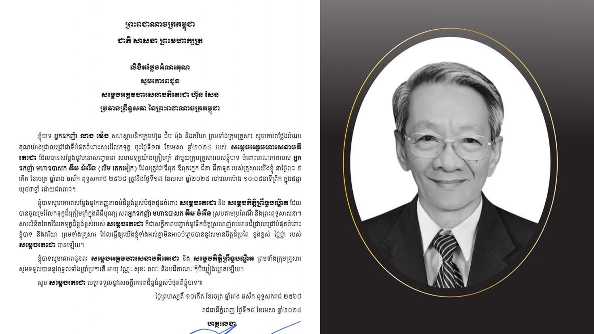 ខ្ញុំបាទសូមគោរពសម្តែងនូវកតញ្ញូតាធម៌ដ៏ខ្ពង់ខ្ពស់បំផុត ជូនចំពោះសម្តេចតេជោ និងសម្តេចកិត្តិព្រឹទ្ធបណ្ឌិត ដែលបានចូលរួមរំលែកទុក្ខដ៏ក្រៀមក្រំ ក្នុងពិធីបុណ្យសពអ្នកឧកញ៉ា មហាឧបាសក គឹម ចំរើន ស្របតាមប្រពៃណី និងព្រះពុទ្ធសាសនា។ សារលិខិតចែករំលែកទុក្ខដ៏ខ្ពង់ខ្ពស់ របស់សម្តេចតេជោ គឺជាសក្ខីភាពបញ្ជាក់នូវទឹកចិត្តស្រលាញ់រាប់អានដ៏ជ្រាលជ្រៅបំផុតចំពោះ ខ្ញុំបាទ និងភរិយា ព្រមទាំងគ្រួសារ ដែលធ្វើឲ្យយើងខ្ញុំទាំងអស់គ្នាមិនអាចបំភ្លេចបាន នូវសមានចិត្តដ៏ប្រពៃ ខ្ពង់ខ្ពស់ ថ្លៃថ្លា របស់សម្តេចតេជោបានឡើយ។