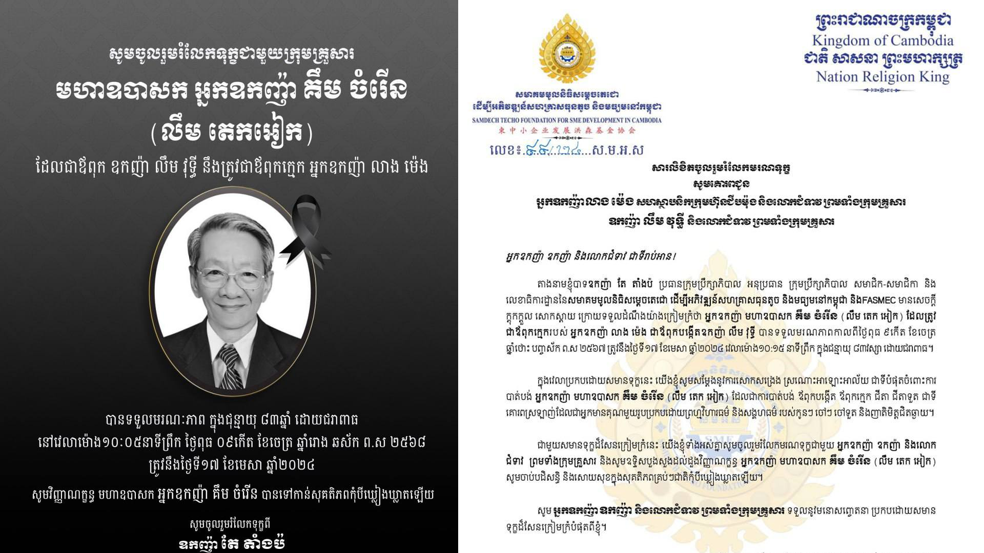 ឧកញ៉ា តែ តាំងប៉ ប្រធានក្រុមប្រឹក្សាភិបាល អនុប្រធាន ក្រុមប្រឹក្សាភិបាល សមាជិក-សមាជិកា និងលេខាធិការដ្ឋាននៃសមាគមមូលនិធិសម្ដេចតេជោ ដើម្បីអភិវឌ្ឍន៍សហគ្រាសធុនតូច និងមធ្យមនៅកម្ពុជា និងFASMEC នៅថ្ងៃទី១៨ ខែមេសា នេះ បានផ្ញើសាររំលែកទុក្ខ ជូនចំពោះ អ្នកឧកញ៉ា លាង ម៉េង សហស្ថាបនិកក្រុមហ៊ុន ជីប ម៉ុង និងភរិយា ព្រមទាំងក្រុមគ្រួសារ ចំពោះមរណភាពរបស់ មហាឧបាសកអ្នកឧកញ៉ា គឹម ចំរើន (លឹម តេកអៀក) ដែលត្រូវជាឪពុកបង្កើតរបស់លោកជំទាវ គឹម ចាន់ណា (ភរិយា អ្នកឧកញ៉ា លាង ម៉េង), លោកឧកញ៉ា លឹម វុទ្ធី និងត្រូវជាឪពុកក្មេករបស់អ្នកឧកញ៉ា លាង ម៉េង ដែលបានធ្វើមរណកាល កាលពីថ្ងៃពុធ ៩កើត ខែចេត្រ ឆ្នាំរោង ឆស័ក ព.ស. ២៥៦៧ ត្រូវនឹងថ្ងៃទី១៧ ខែមេសា ឆ្នាំ២០២៤ វេលាម៉ោង ១០:០៥ នាទីព្រឹកក្នុងជន្មាយុ ៨៣ឆ្នាំ ដោយជរាពាធ។