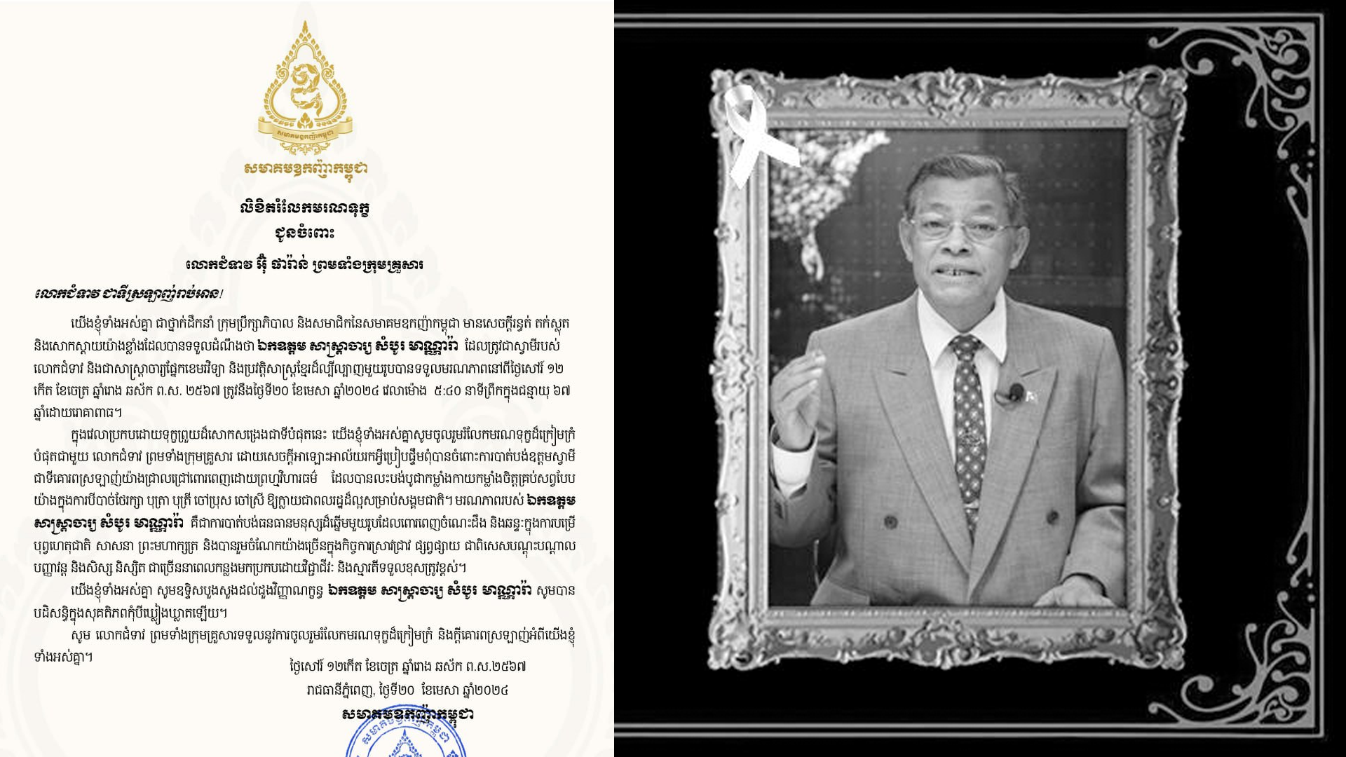 សមាគមឧកញ៉ាកម្ពុជា ផ្ញើសាររំលែកទុកលោកស្រី អ៊ុំ ផារ៉ាន់ ចំពោះមរណភាពសាស្ត្រាចារ្យ សំបូរ មាណ្ណារ៉ា