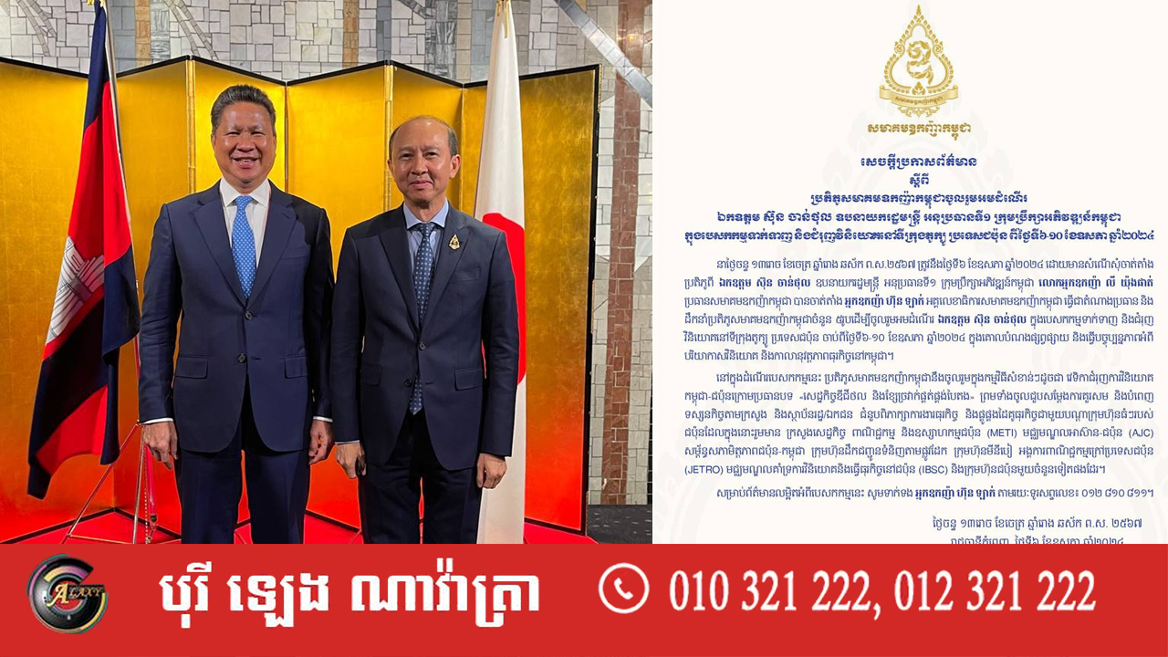 សេចក្តីប្រកាសព័ត៌មាន ស្តីពី ប្រតិភូសមាគមឧកញ៉ាកម្ពុជាចូលរួមអមដំណើរ ឯកឧត្តម ស៊ុន ចាន់ថុល ឧបនាយករដ្ឋមន្ត្រី អនុប្រធានទី១ ក្រុមប្រឹក្សាអភិវឌ្ឍន៍កម្ពុជាក្នុងបេសកកម្មទាក់ទាញ និងជំរុញវិនិយោគនៅទីក្រុងតូក្យូ ប្រទេសជប៉ុន ពីថ្ងៃទី៦-១០ ខែឧសភា ឆ្នាំ២០២៤។