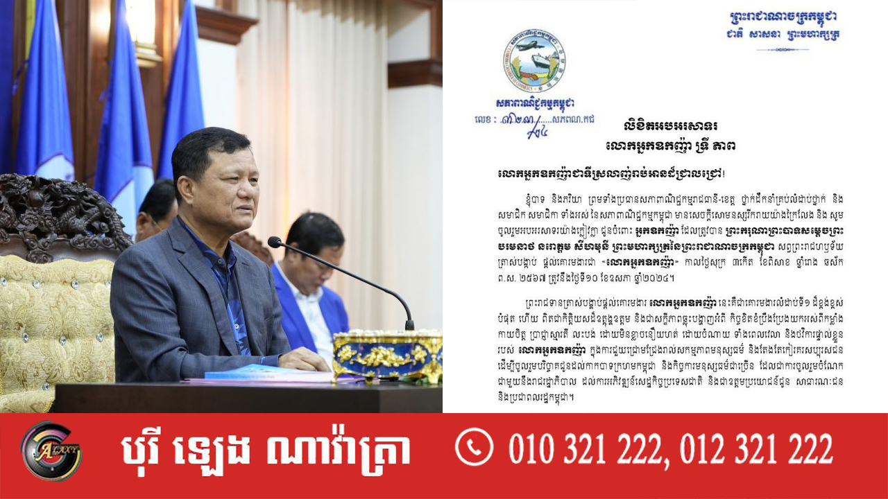 ខ្លឹមសារលិខិតរបស់សភាពាណិជ្ជកម្មកម្ពុជា បានបន្តថា ព្រះរាជទានត្រាស់បង្គាប់ផ្តល់គោរមងារ លោកអ្នកឧកញ៉ា នេះគឺជាគោរមងារលំដាប់ទី១ ដ៏ខ្ពង់ខ្ពស់បំផុត ហើយពិតជាកិត្តិយសដ៏ឧត្តុងឧត្តម និងជាសក្ខីភាពឆ្លុះបង្ហាញអំពី កិច្ចខិតខំប្រឹងប្រែងយកអស់ពីកម្លាំងកាយចិត្ត ប្រាជ្ញាស្មារតី លះបង់ ដោយមិនខ្លាចនឿយហត់ ដោយចំណាយទាំងពេលវេលា និងថវិកាផ្ទាល់ខ្លួនរបស់ លោកអ្នកឧកញ៉ា ក្នុងការជួយជ្រោមជ្រែងរាល់សកម្មភាពមនុស្សធម៌ និងតែងកៀរគរសប្បុរសជន ដើម្បីចូលរួមបរិច្ចាគជូនដល់កាកបាទក្រហមកម្ពុជា និងកិច្ចការមនុស្សធម៌ជាច្រើន ដែលជាការចូលរួមចំណែកជាមួយនឹងរាជរដ្ឋាភិបាល ដល់ការអភិវឌ្ឍន៍សេដ្ឋកិច្ចប្រទេសជាតិ និងជាឧត្តមប្រយោជន៍ជូនសាធារណៈជន និងប្រជាពលរដ្ឋកម្ពុជា។