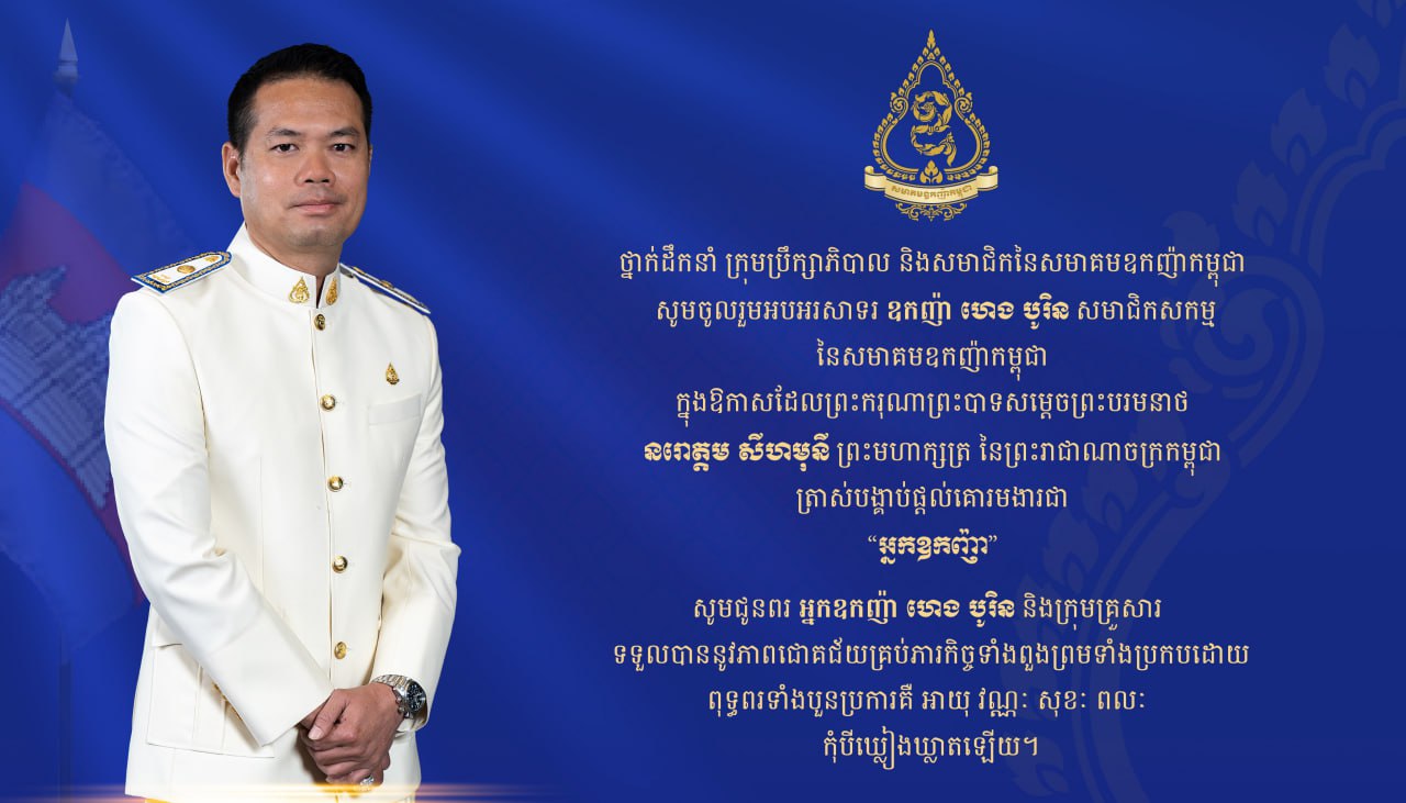 ថ្នាក់ដឹកនាំ ក្រុមប្រឹក្សាភិបាល និងសមាជិកនៃសមាគមឧកញ៉ាកម្ពុជា សូមចូលរួមអបអរសាទរ ឧកញ៉ា ហេង បូរិន សមាជិកសកម្មនៃសមាគមឧកញ៉ាកម្ពុជា ក្នុងឱកាសដែលព្រះករុណាព្រះបាទសម្តេចព្រះបរមនាថ នរោត្តម សីហមុនី ព្រះមហាក្សត្រ នៃព្រះរាជាណាចក្រកម្ពុជាត្រាស់បង្គាប់ផ្តល់គោរមងារជា «អ្នកឧកញ៉ា»។