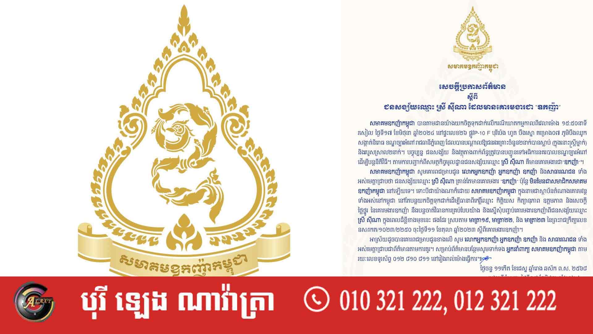 សេចក្ដីប្រកាសព័ត៌មាន របស់ សមាគមឧកញ៉ាកម្ពុជា ធ្វើឡើងតែប៉ុន្មានម៉ោងប៉ុណ្ណោះ បន្ទាប់ពីមានករណីឃាតកម្មមួយបានកើតឡើង កាលពីវេលាម៉ោង ១៥:៥០នាទីរសៀល ថ្ងៃទី១៧ ខែមិថុនា ឆ្នាំ២០២៤ នៅផ្ទះលេខ២៦ ក្នុង បុរីប៉េង ហួត បឹងស្នោ ស្ថិតនៅភូមិបឹងឈូក សង្កាត់និរោធ ខណ្ឌច្បារអំពៅ រាជធានីភ្នំពេញ។