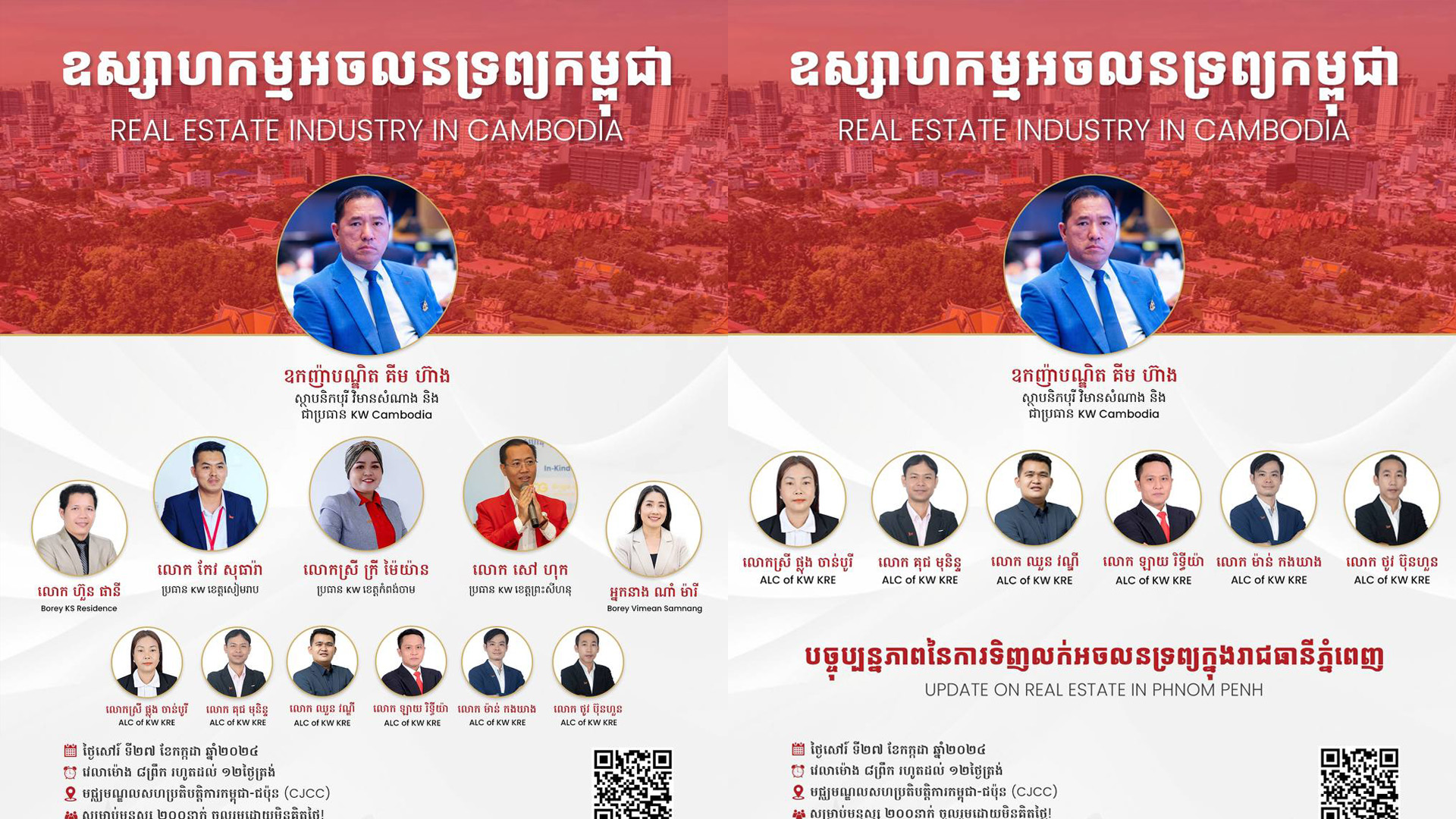 KW Cambodia គ្រោងនឹងបើកសិក្ខាសាលាស្តីអំពី «ឧស្សាហកម្មអចលនទ្រព្យ» សម្រាប់អ្នកចូលរួមចំនួន ២០០នាក់ ដោយមិនគិតថ្លៃ នៅថ្ងៃទី ២៧ ខែកក្កដា ឆ្នាំ២០២៤ ខាងមុខនេះ ចាប់ពីវេលាម៉ោង ៨ព្រឹក ដល់ម៉ោង ១២ថ្ងៃត្រង់ នៅមជ្ឈមណ្ឌលសហប្រតិបត្តិការកម្ពុជា-ជប៉ុន (CJCC)។