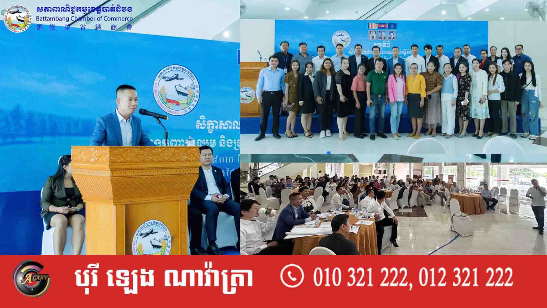 អ្នកឧកញ៉ា ភួ វាសនា អនុប្រធានសភាពាណិជ្ជកម្មកម្ពុជា និងប្រធានសភាពាណិជ្ជកម្មខេត្តបាត់ដំបង លោកអនុប្រធាន សមាជិក សមាជិកា លោកប្រធាន សមាគមសហគ្រិនវ័យក្មេងកម្ពុជា សាខាខេត្ត,សមាគមសហគ្រិនឈានមុខខេត្ត,សមាគមសណ្ឋាគារខេត្ត និងម្ចាស់អាជីវកម្ម សរុបចំនួន១០២នាក់ នាព្រឹកថ្ងៃចន្ទ ទី២៥ ខែកក្កដា ឆ្នាំ២០២៤នេះ សរុបចំនួន ១០២នាក់ បានរៀបចំសិក្ខាសាលាដ៏សំខាន់មួយស្ដីអំពី “ការចងក្រងបញ្ហាប្រឈម និងប្រមូលផ្ដុំគំនិតច្នៃប្រឌិត ដើម្បីអភិវឌ្ឍន៍អាជីវកម្ម” នៅសាលប្រជុំសភាពាណិជ្ជកម្មខេត្តបាត់ដំបង ក្នុងផ្សារទំនើបភួ ពុយ ជាន់ផ្ទាល់ដី ។
