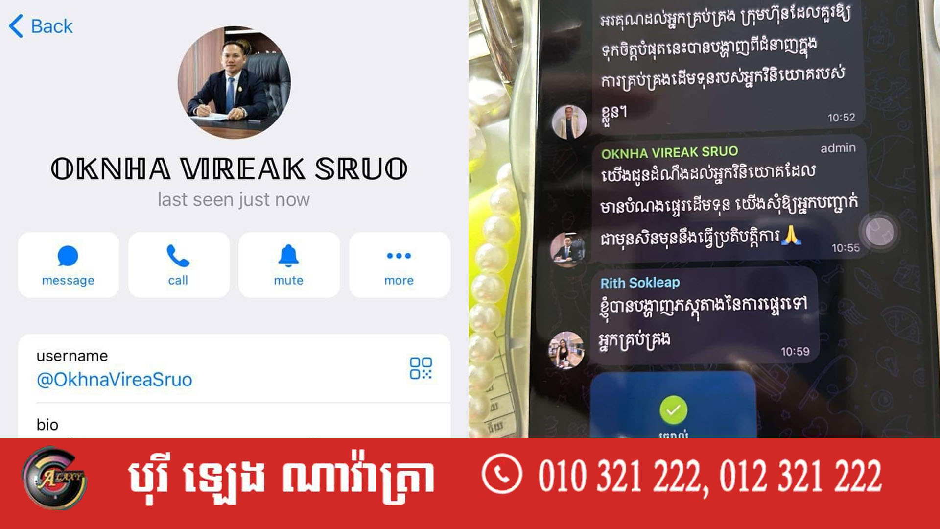 សូមជម្រាបជូនថា កាលពីចុងខែមិថុនាកន្លងទៅ អ្នកឧកញ៉ា សួរ វីរៈ បានជូនដំណឹងម្ដងរួចមកហើយ អំពីការក្លែងបន្លំតេឡេក្រាមដាក់ភ្ជាប់ជាមួយរូបអ្នកឧកញ៉ា របស់ជនខិលខូច ដែលបានបង្កើតឡើងនៅក្នុងគោលបំណងទាក់ទាញបងប្អូនទាំងអស់រកស៊ីបណ្ដាក់ទុនតាមប្រព័ន្ធអនឡាញ៕