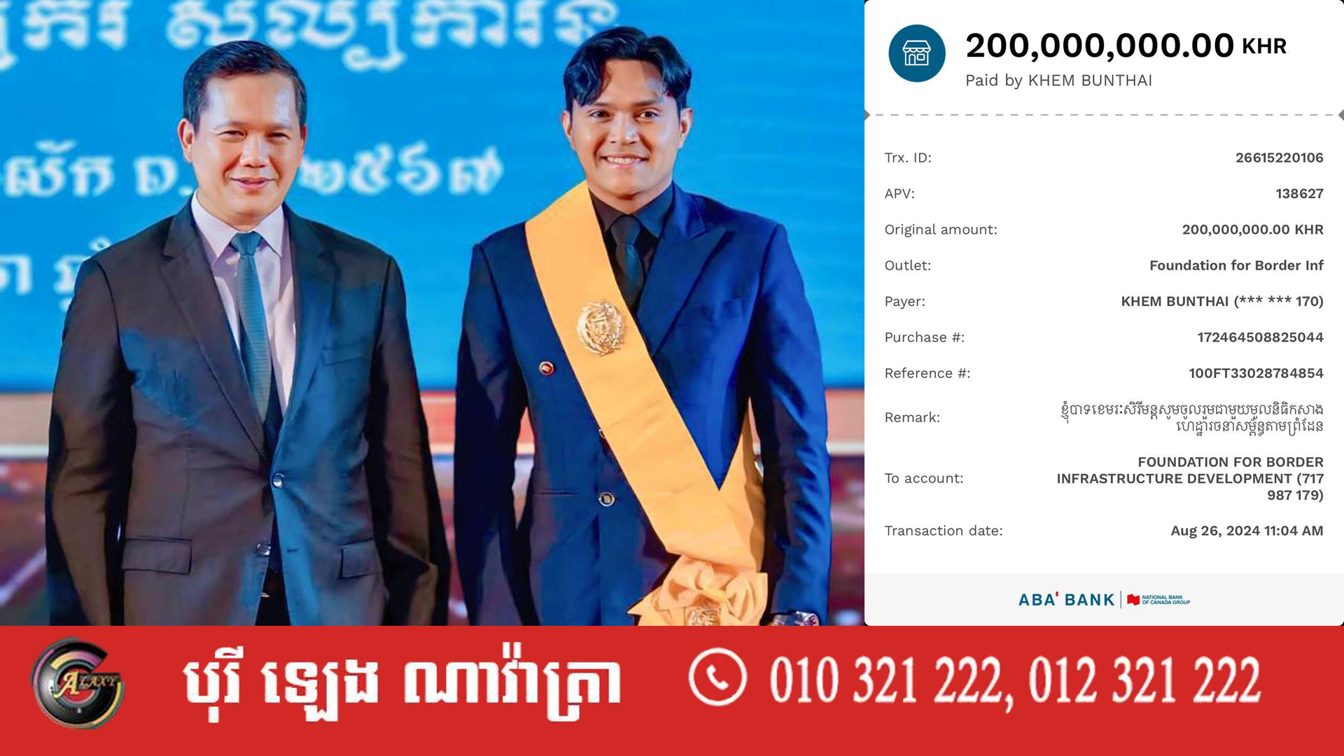 ឧកញ៉ា ខេមរៈ សិរីមន្ដ និងលោកជំទាវ ប្រកាសបរិច្ចាគថវិកា ២០០លានរៀល ដល់ «មូលនិធិកសាងហេដ្ឋារចនាសម្ព័ន្ធតាមព្រំដែន» ដើម្បីចូលរួមជាមួយរាជរដ្ឋាភិបាល ដើម្បីកសាងហេដ្ឋារចនាសម្ព័ន្ធនានា នៅតាមបណ្តោយព្រំដែន។