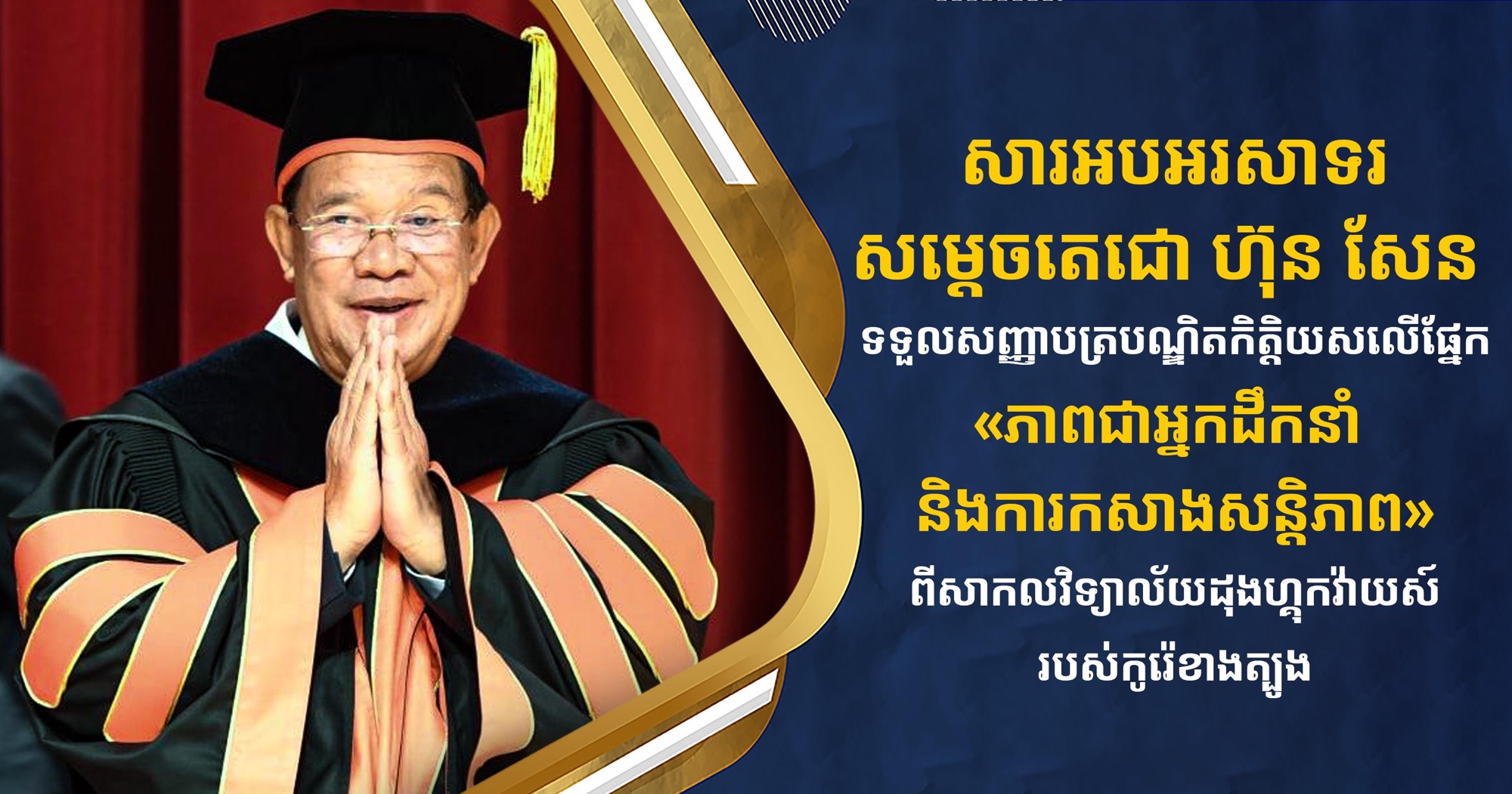 ពិធីប្រគល់ និងទទួលសញ្ញាបត្របណ្ឌិតកិត្តិយសរបស់សម្តេចតេជោ ហ៊ុន សែន ត្រូវបានធ្វើឡើងនៅខេត្តឃ្យុងសាងបុកដូ សាធារណរដ្ឋកូរ៉េ ក្នុងឱកាសសម្តេចតេជោ អញ្ជើញធ្វើបាឋកថា ស្តីពី «បទពិសោធន៍របស់កម្ពុជា ក្នុងការរំដោះជាតិ ការកសាងសន្តិភាព ការផ្សះផ្សា និងកសាងជាតិឡើងវិញ» ចន្លោះថ្ងៃទី១១-១៣ ខែកញ្ញា ឆ្នាំ២០២៤។
