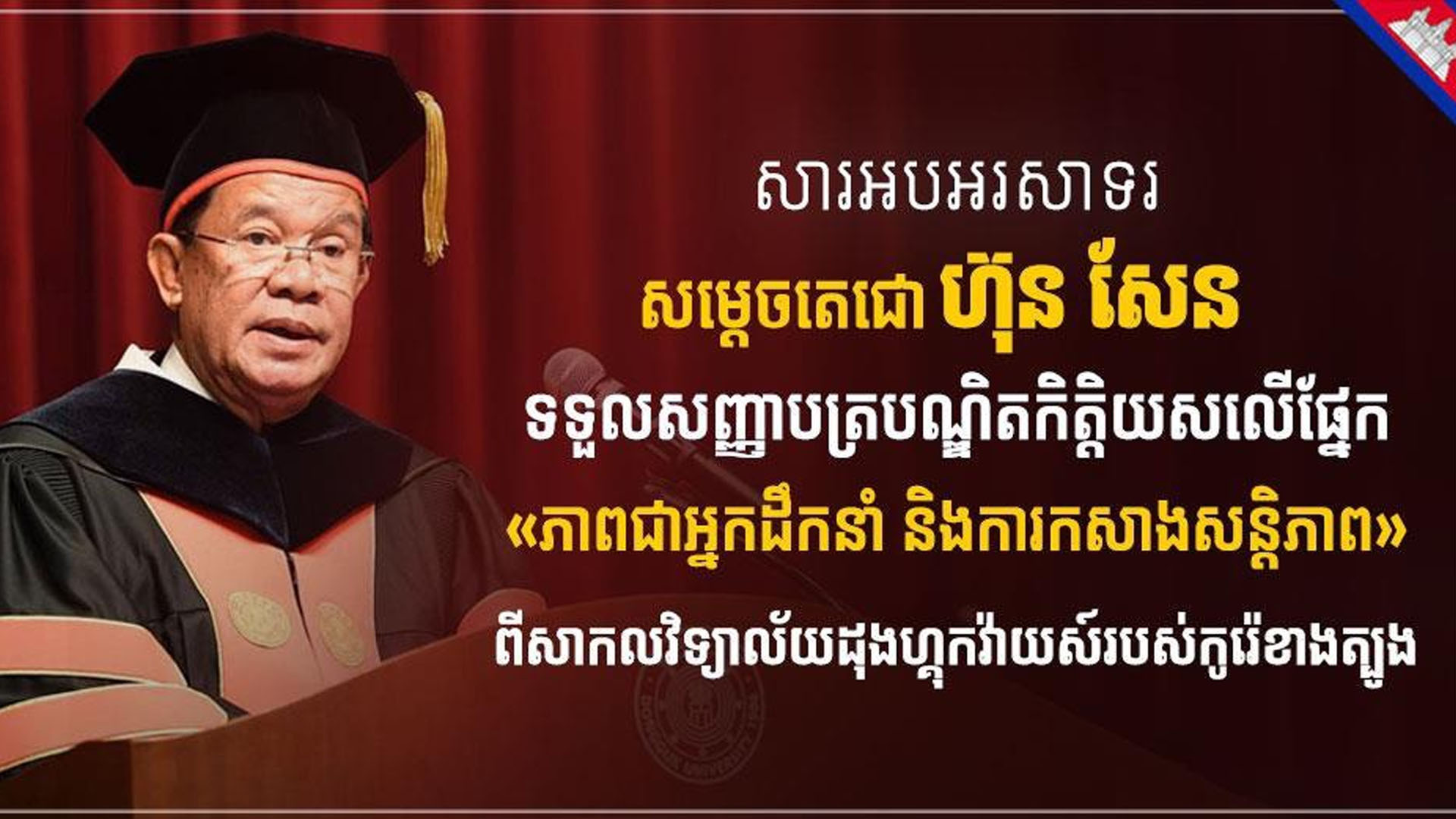 ពិធីប្រគល់ និងទទួលសញ្ញាបត្របណ្ឌិតកិត្តិយសរបស់សម្តេចតេជោ ហ៊ុន សែន ត្រូវបានធ្វើឡើងនៅខេត្តឃ្យុងសាងបុកដូ សាធារណរដ្ឋកូរ៉េ ក្នុងឱកាសសម្តេចតេជោ អញ្ជើញធ្វើបាឋកថា ស្តីពី «បទពិសោធន៍របស់កម្ពុជា ក្នុងការរំដោះជាតិ ការកសាងសន្តិភាព ការផ្សះផ្សា និងកសាងជាតិឡើងវិញ» ចន្លោះថ្ងៃទី១១-១៣ ខែកញ្ញា ឆ្នាំ២០២៤។