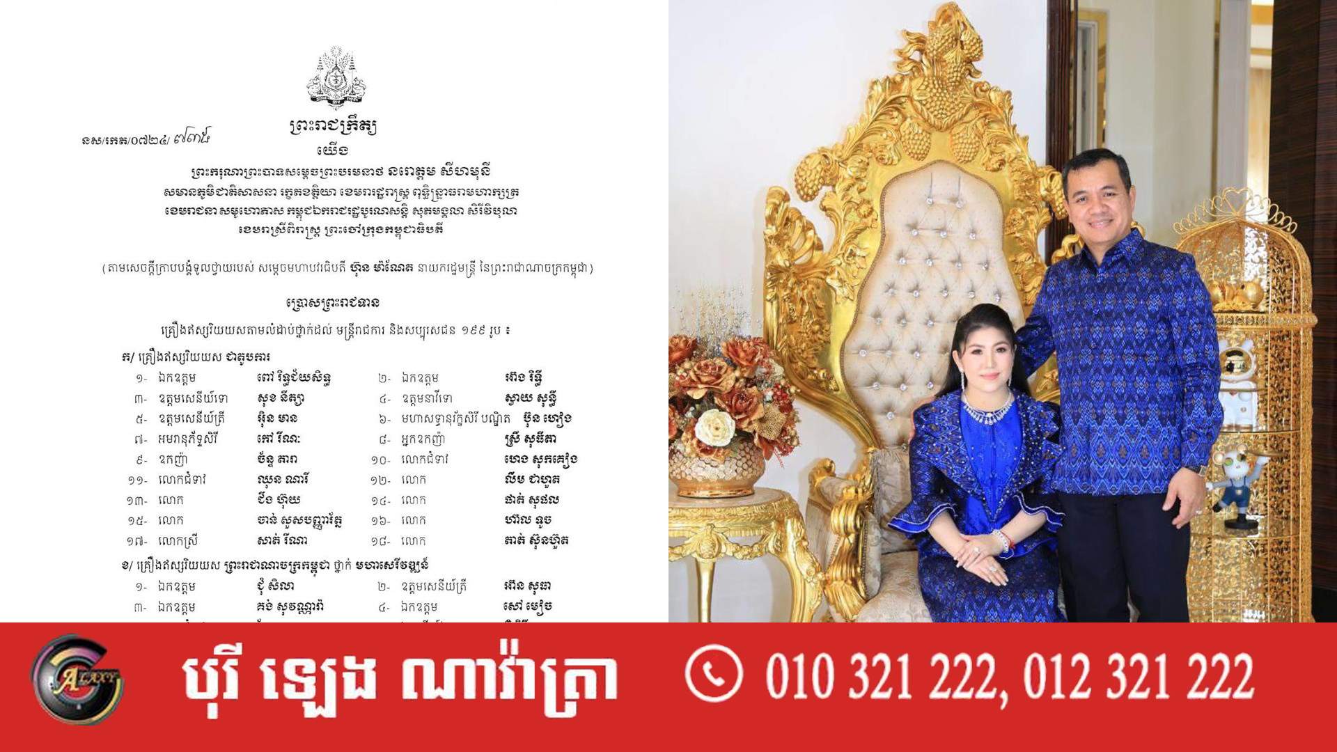 តាមរយៈព្រះរាជក្រឹត្យលេខ នស/រកត/០៧២៤/៧៣៥ ព្រះមហាក្សត្រ បានប្រោសព្រះរាជទានគ្រឿងឥស្សរិយយសតាមលំដាប់ថ្នាក់ដល់ មន្ត្រីរាជការ និងសប្បុរសជនសរុបចំនួន ១៩៩រូប។ ក្នុងនោះដែរ មេដាយជាតូបការ មានចំនួន១៨រូប រួមទាំង ជំទាវអ្នកឧកញ៉ា ស្រី សុធីតា និងឧកញ៉ា ច័ន្ទ តារា ផងដែរ។
