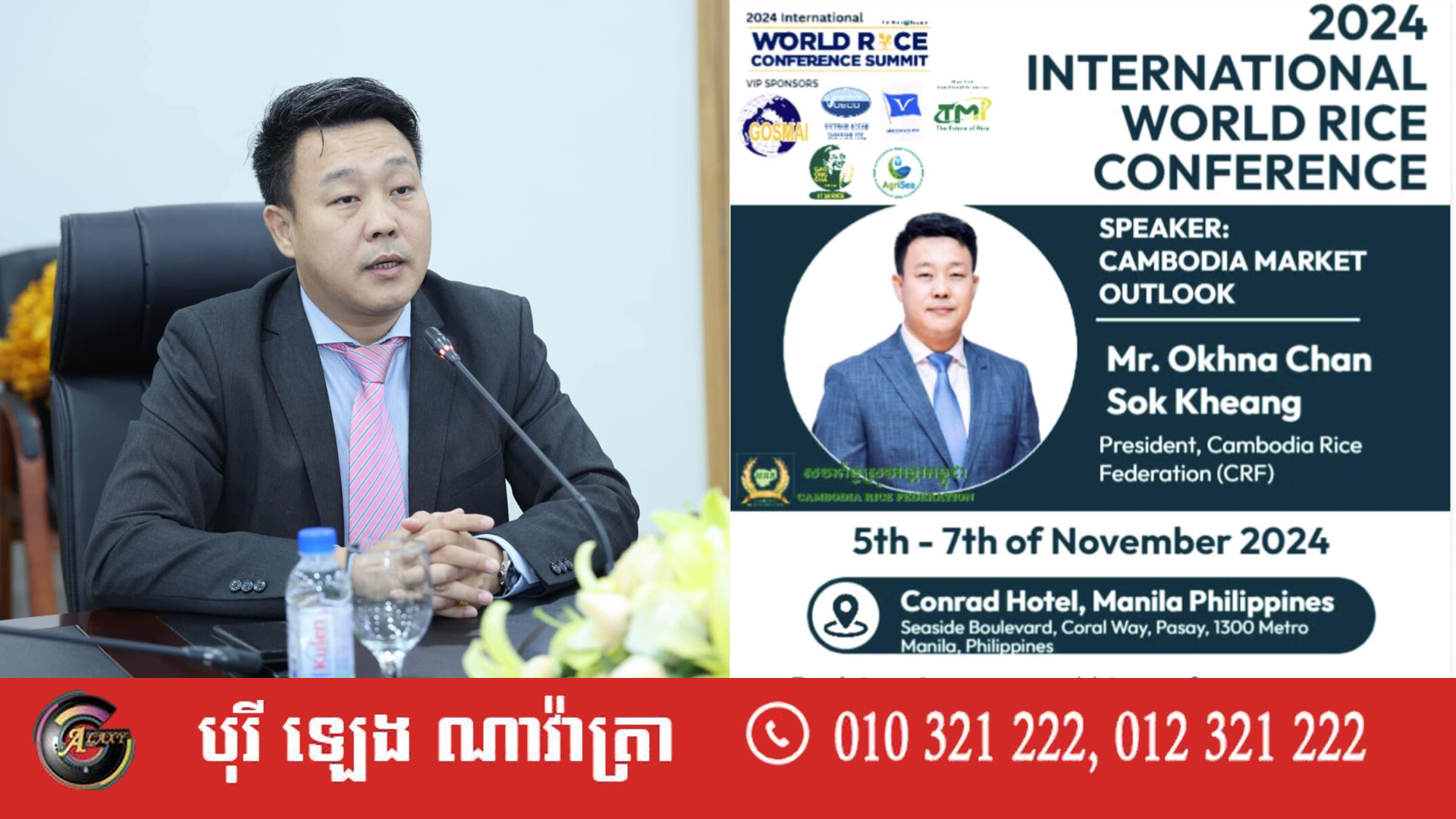 ឧកញ៉ា ចាន់ សុឃាំង ប្រធានសហព័ន្ធស្រូវអង្ករកម្ពុជា នឹងអញ្ជើញចូលរួមធ្វើជាវាគ្មិនក្នុងកម្មវិធីសន្និសីទអង្ករពិភពលោកអន្តរជាតិ (2024 International World Rice Conference) នៅទីក្រុងម៉ានីល ប្រទេសហ្វីលីពីន នៅដើមខែវិច្ឆិកា ខាងមុខនេះ។
