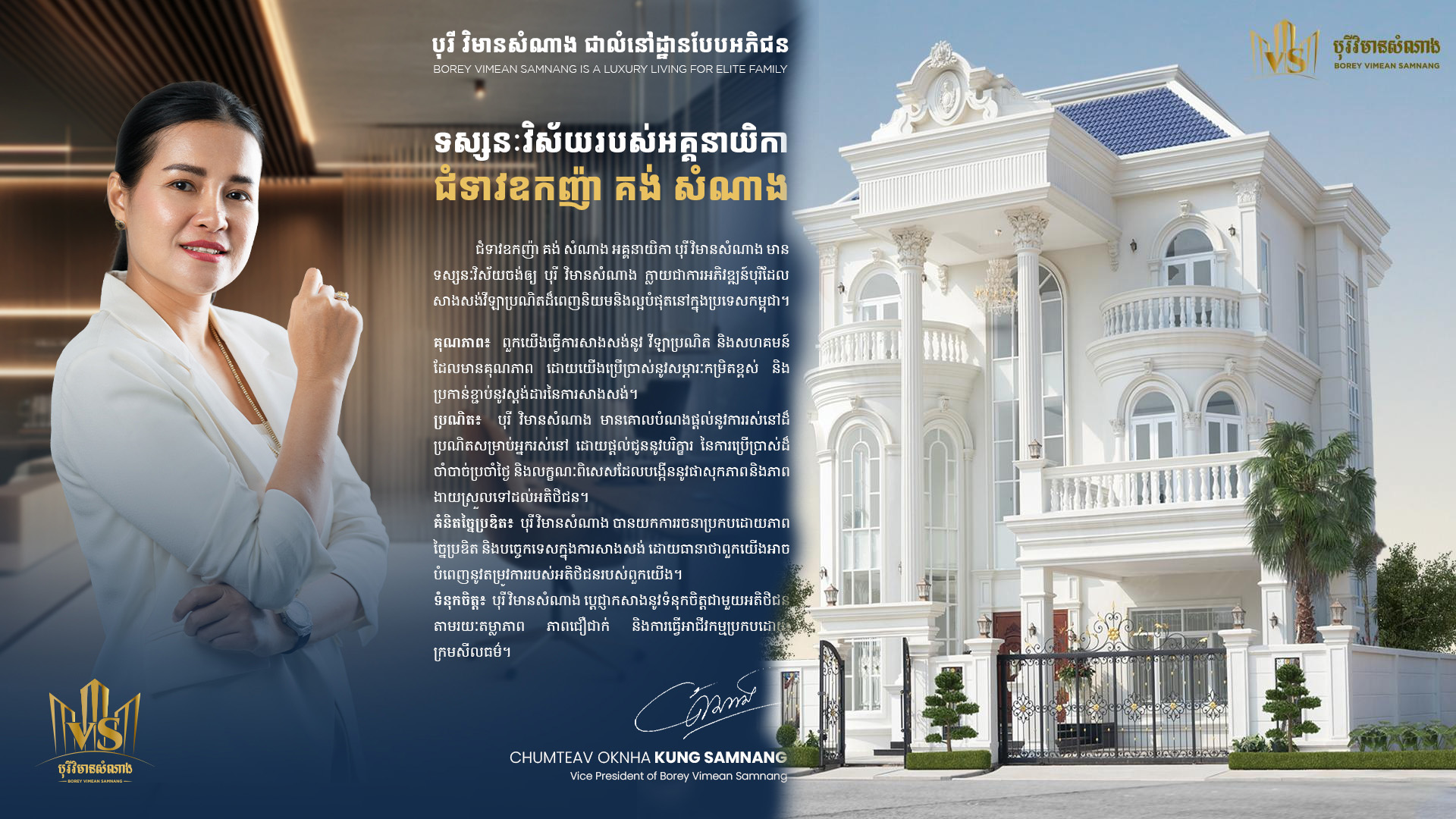 ជំទាវឧកញ៉ា គង់ សំណាង អគ្គនាយិកា បុរី វិមានសំណាង មានទស្សនៈវិស័យចង់ឲ្យ បុរី វិមានសំណាង ក្លាយជាការអភិវឌ្ឍន៍បុរីដែលសាងសង់វីឡាប្រណិតដ៏ពេញនិយមនិងល្អបំផុតនៅក្នុងប្រទេសកម្ពុជា។